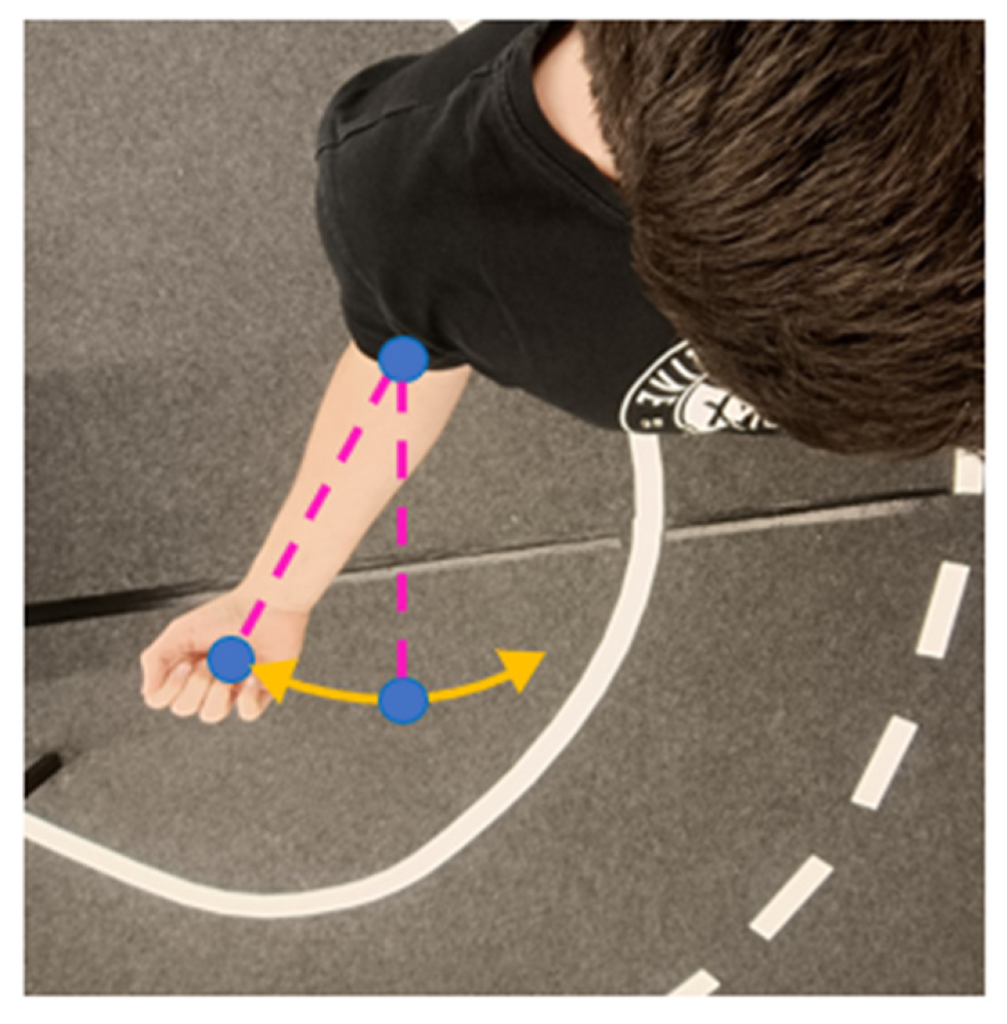 Elbow yaw defines the axial rotation of the forearm around the upper arm’s longitudinal axis, a motion that is inherently more difficult to capture via image-based estimation. The method employed here uses three points: the wrist, the elbow, and an auxiliary projection point that shares the x-coordinate of the elbow and the z-coordinate of the wrist, forming a reference plane for yaw detection (see