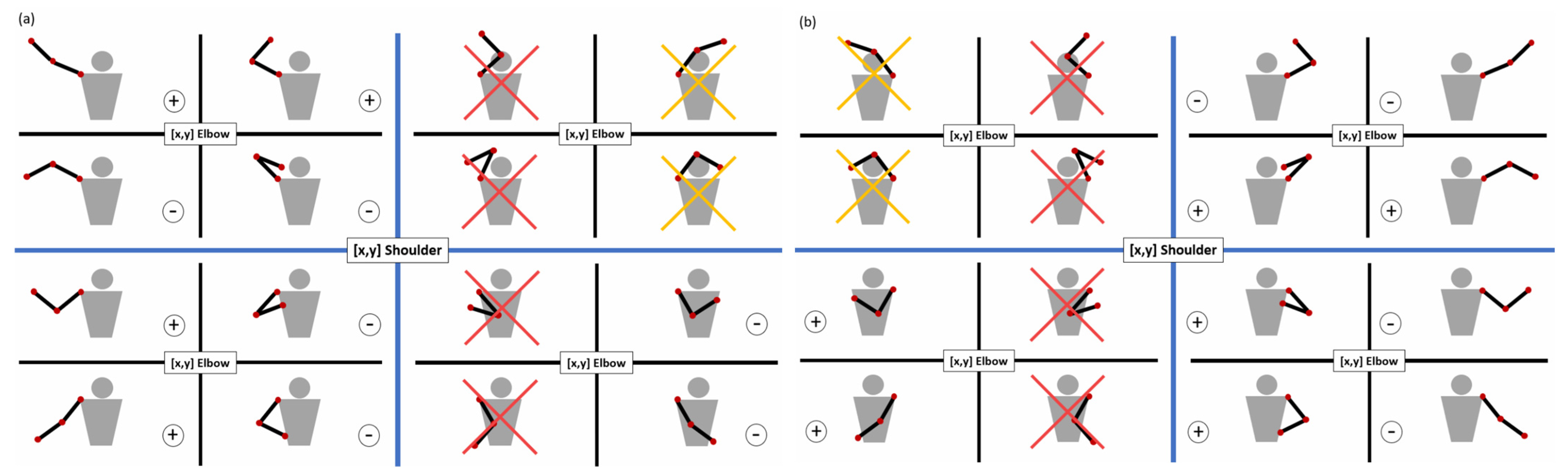 A detailed classification of elbow torsion was conducted, analyzing combinations of relative positions of the shoulder, elbow, and wrist. This results in 16 possible positional scenarios: 4 combinations of elbow coordinates relative to the shoulder (based on x and y), each subdivided into 4 possible wrist positions relative to the elbow. These configurations are summarized in