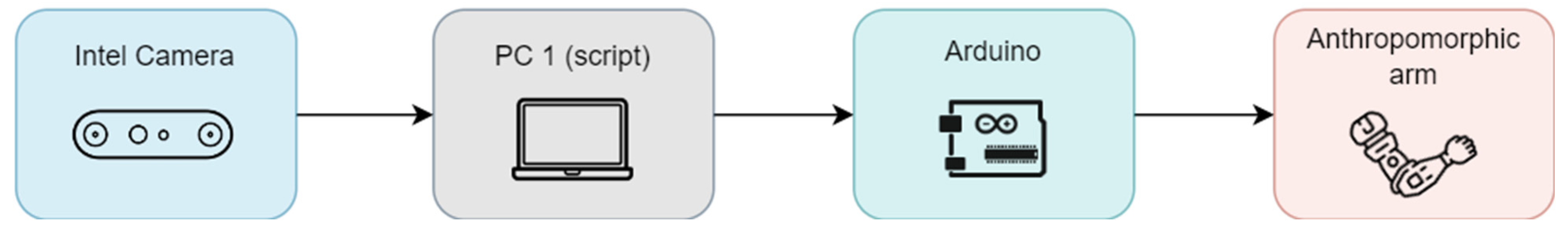 Figure 14, the system architecture consists of an Intel RealSense camera, a processing unit (PC1), the Arduino board, and the robotic arm itself.