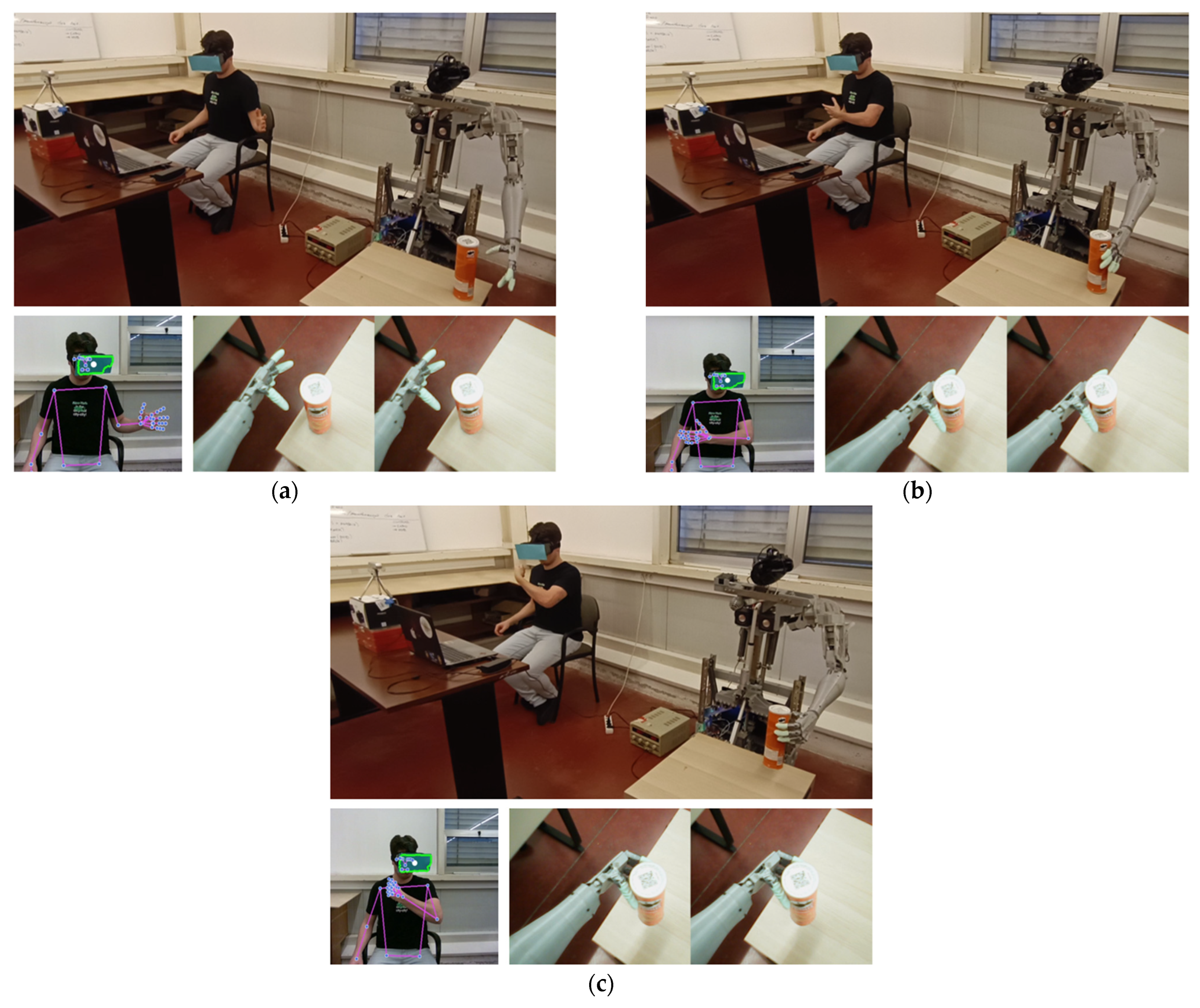 Figure 17c, the object is successfully grasped. Across repeated trials, the robot successfully completed the reach–grasp–lift sequence without loss of object stability, demonstrating consistent mapping between human arm motion and robotic actuation. These results demonstrate the system’s capacity for precise and responsive manipulation under VR-based teleoperation.
