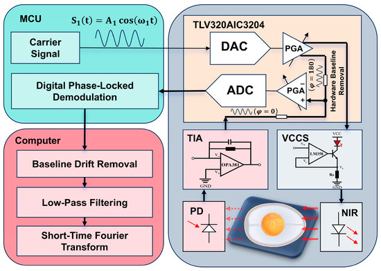 After demodulation, the extracted PPG amplitude values are transmitted from the MCU to a host computer via a serial communication interface for further visualization and time–frequency analysis. The complete system workflow—involving optical modulation, photodetection, digital demodulation, and data transmission in turn—is fully implemented on the embedded platform, enabling real-time and continuous PPG monitoring of chicken embryos.