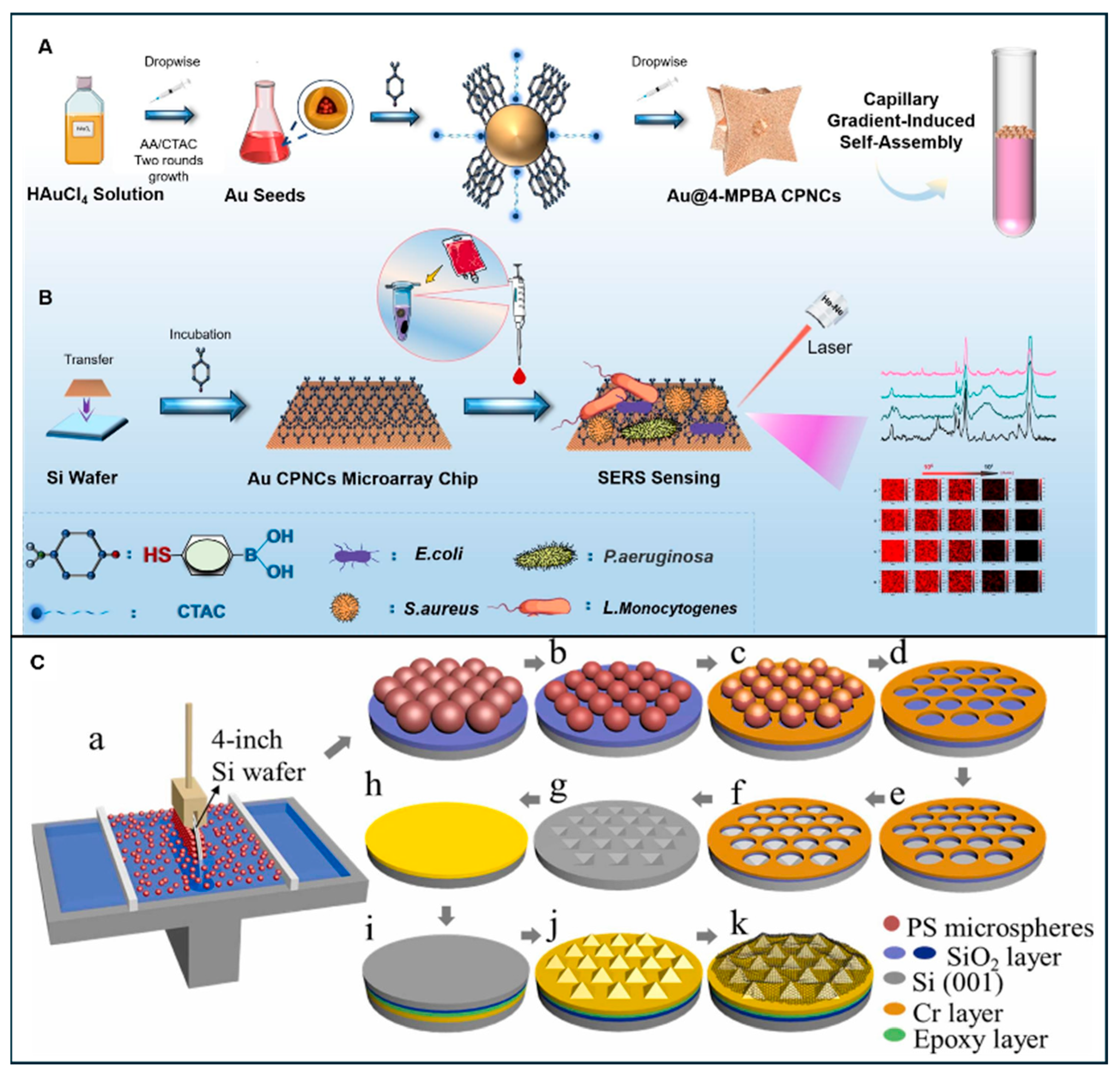 - Wang, Y.; Ni, H.; Li, H.; Chen, J.; Zhang, D.; Fu, L. Plasmonic Microneedle Arrays for Rapid Extraction, SERS Detection, and Inactivation of Bacteria. Chem. Eng. J. 2022, 442, 136140. [Google Scholar] [CrossRef]