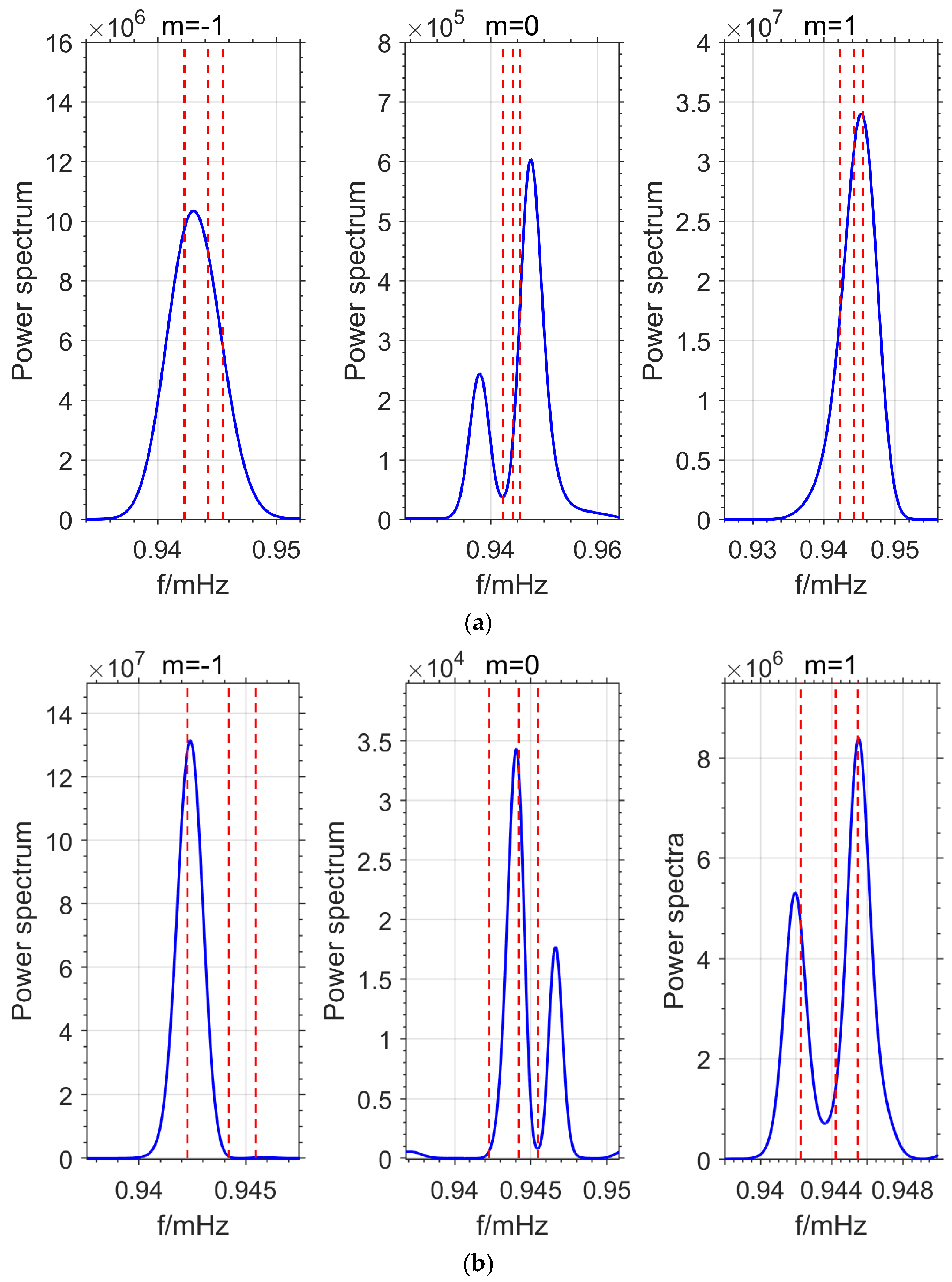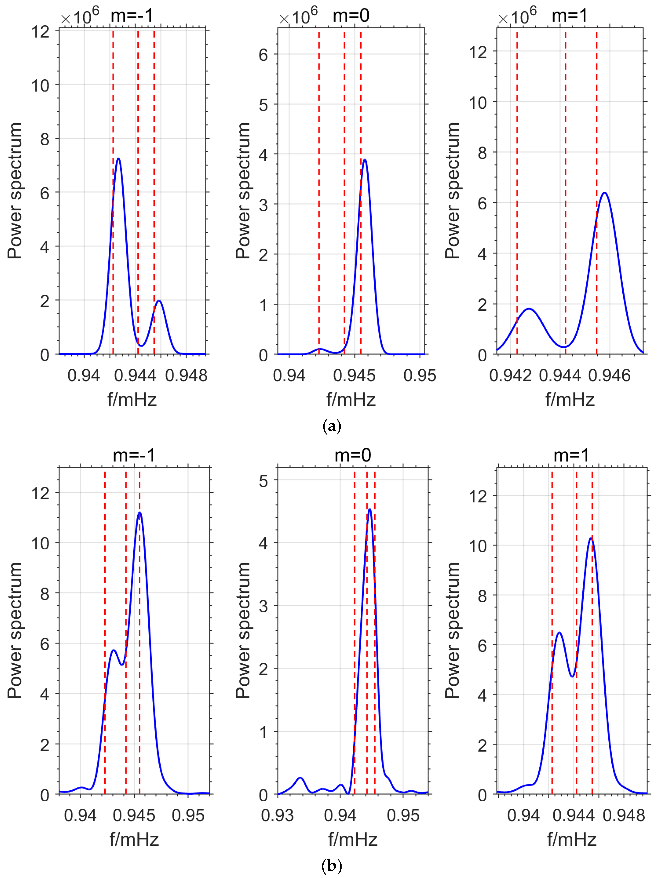 | Splitting Modes | m = −1 (mHZ) | m = 0 (mHZ) | m = 1 (mHZ) |