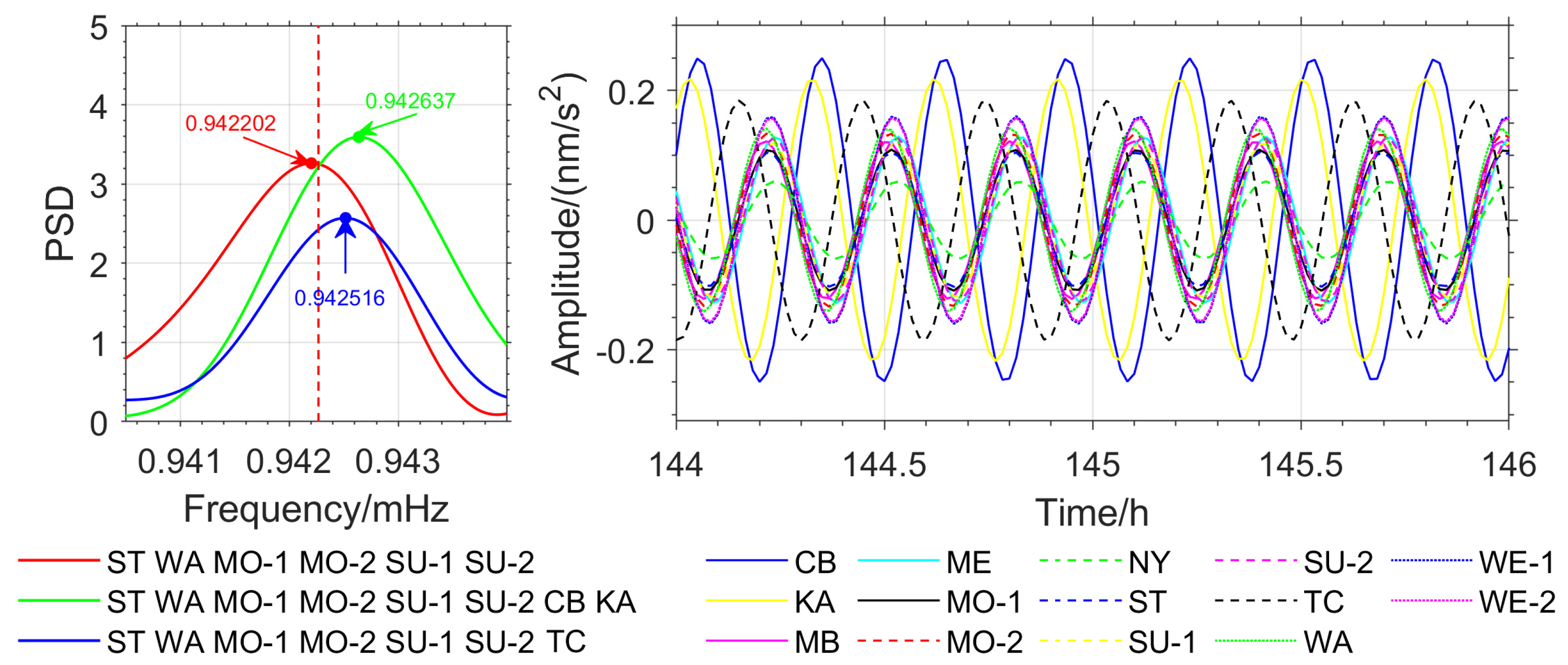 - Zhang, Y.; Xu, G.; Wang, C.; Zhao, Y.; Mu, Z.; Fan, Y.; Jing, C. Detection of Earth’s free oscillation and analysis of the non-synchronous oscillation phenomenon of normal modes. Geosci. Front. 2025, 16, 101957. [Google Scholar] [CrossRef]