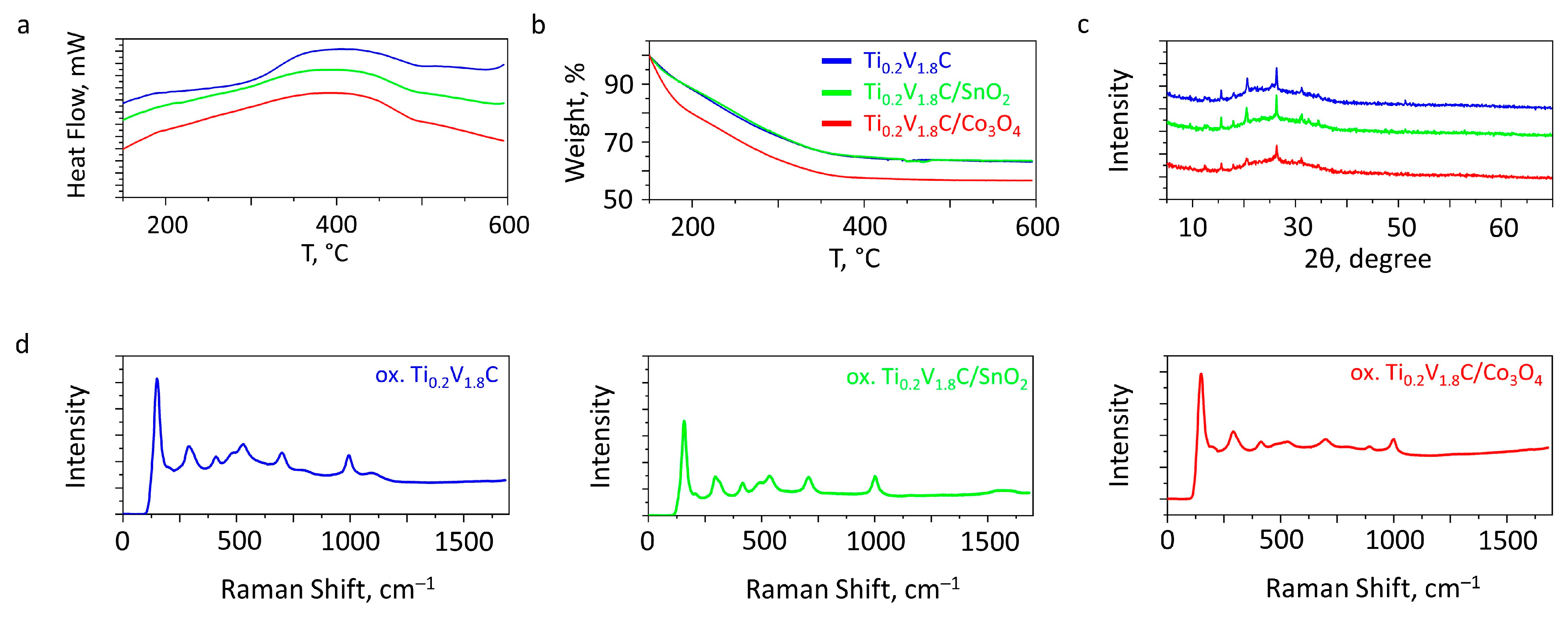 | Oxidized Ti0.2V1.8C | Ti0.2V1.8C/SnO2 | Ti0.2V1.8C/Co3O4 | |