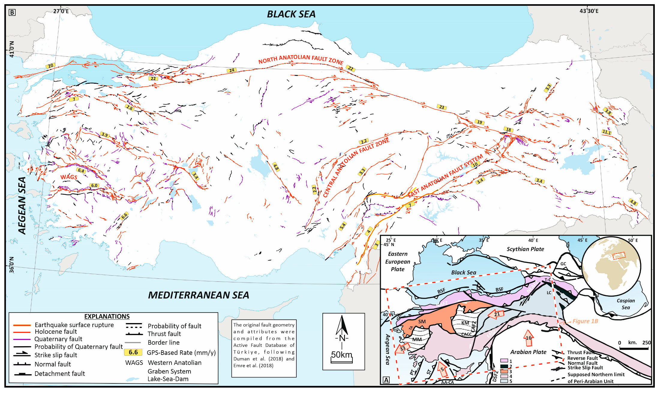 - Bozkurt, E. Neotectonics of Turkey—A synthesis. Geodin. Acta 2001, 14, 3–30. [Google Scholar] [CrossRef]