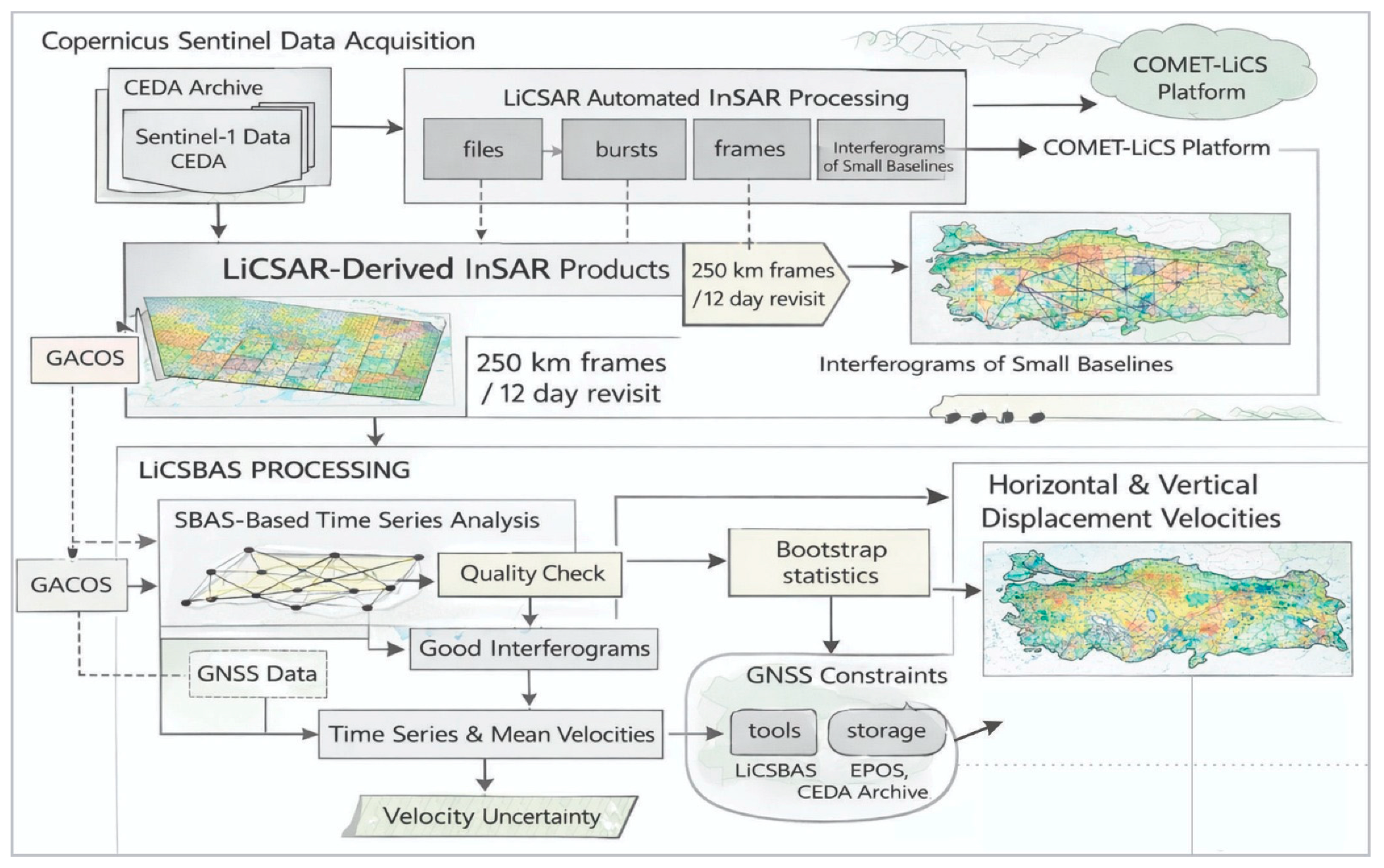- Lazecký, M.; Spaans, K.; González, P.J.; Maghsoudi, Y.; Morishita, Y.; Albino, F.; Elliott, J.; Greenall, N.; Hatton, E.L.; Hooper, A.; et al. LiCSAR: An automatic InSAR tool for measuring and monitoring tectonic and volcanic activity. Remote Sens. 2020, 12, 2430. [Google Scholar] [CrossRef]