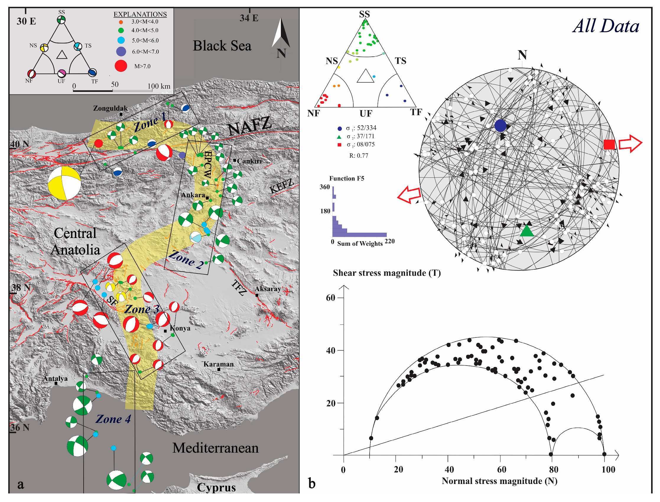 - Delvaux, D.; Sperner, B. Stress tensor inversion from fault kinematic indicators and focal mechanism data: The TENSOR program, Nieuwland (Doctoral dissertation, D. (ed.), New Insights into Structural Interpretation and Modelling. Geol. Soc. Lond. Spec. Publ. 2003, 212, 75–100. [Google Scholar]