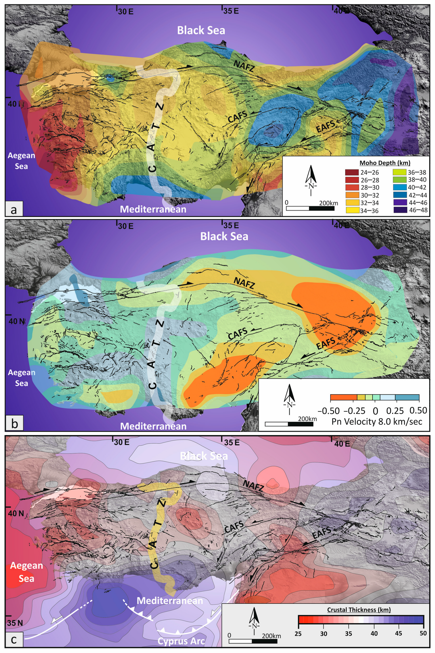 - Tezel, T.; Shibutani, T.; Kaypak, B. Crustal thickness of Turkey determined by receiver function. J. Asian Earth Sci. 2013, 75, 36–44. [Google Scholar] [CrossRef]