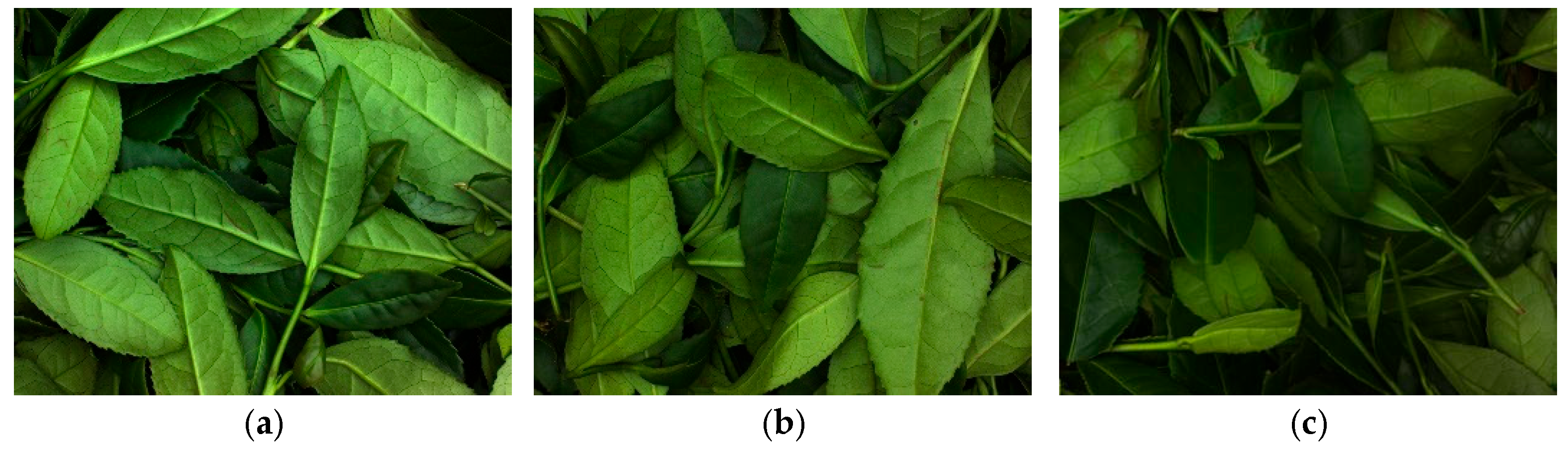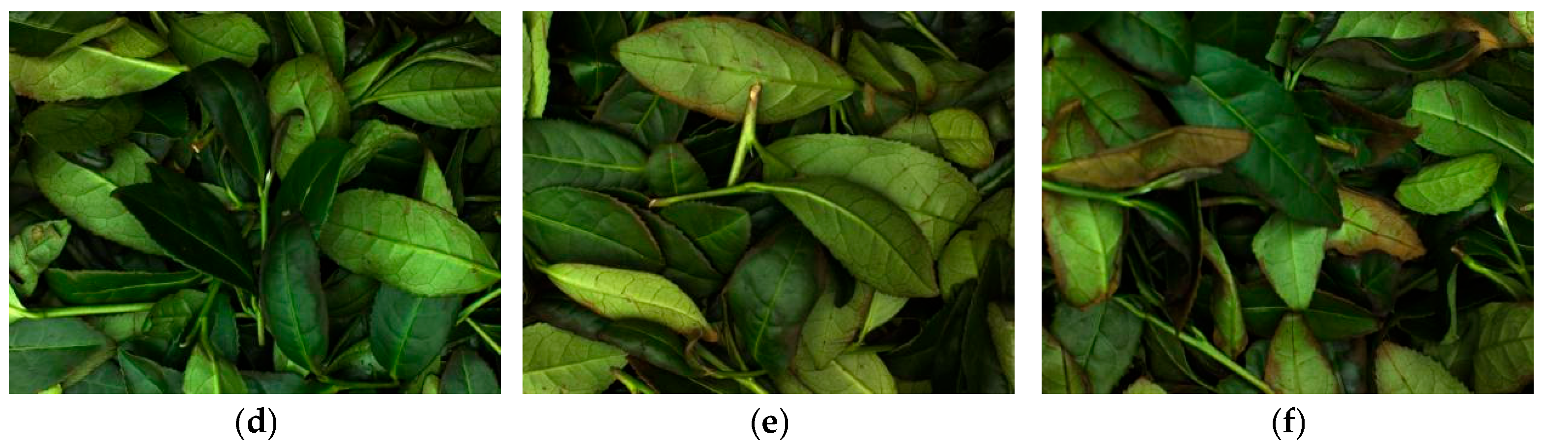 - Ge, B.; Zhang, X.; Liu, S.; Yang, Y.; Zhou, T.; Fu, D. Identification of yellowing degree of yellow teabased on lightweight neural network MobileNetV3-large. J. Hunan Agric. Univ. (Nat. Sci.) 2024, 50, 91–99. [Google Scholar]