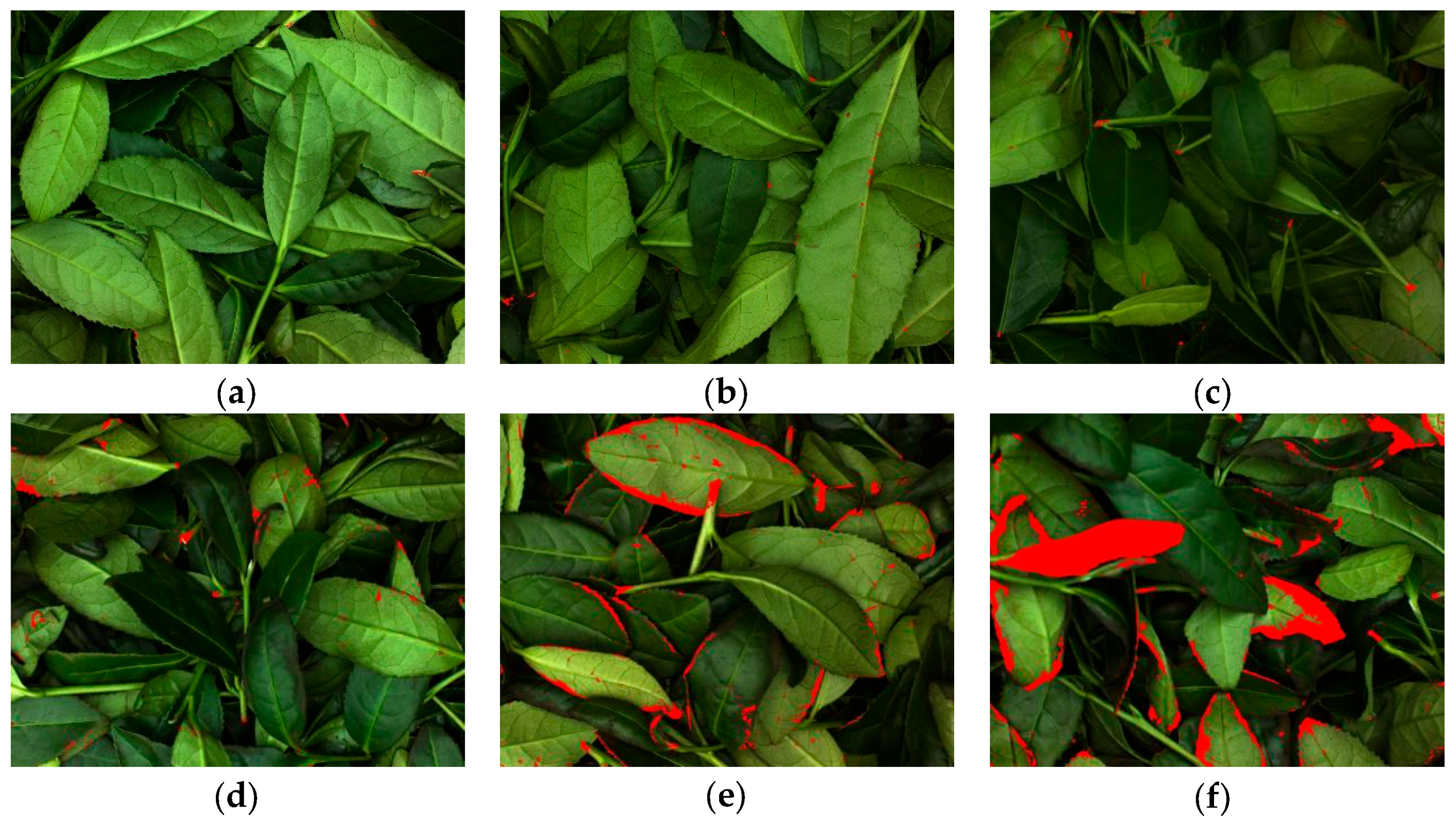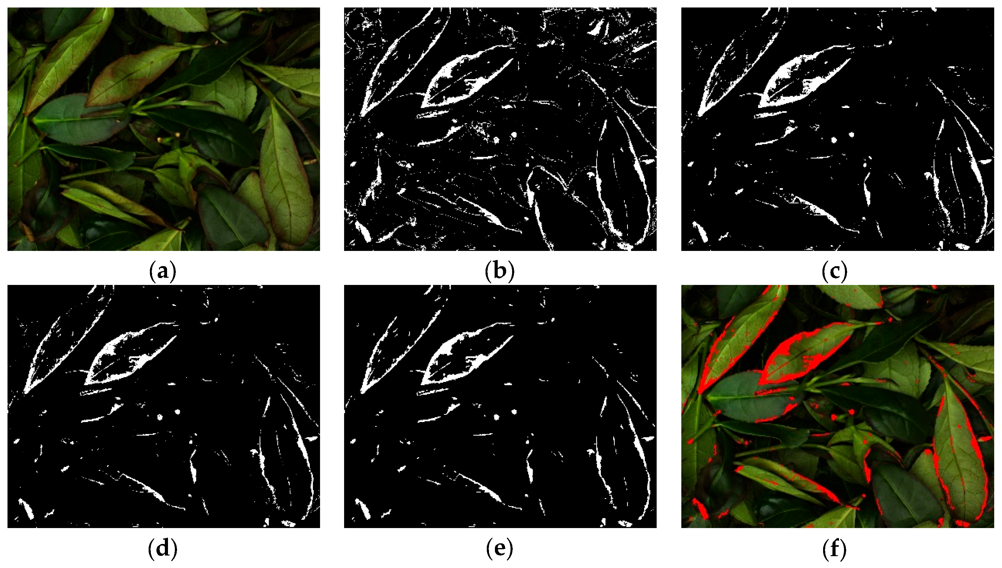 Figure 3b). The determination of these thresholds was based on the empirical judgment of tea-making experts regarding the color changes in leaf stems and blades across different green-making stages, and their stability in segmentation performance was validated through repeated tests on multiple representative samples.