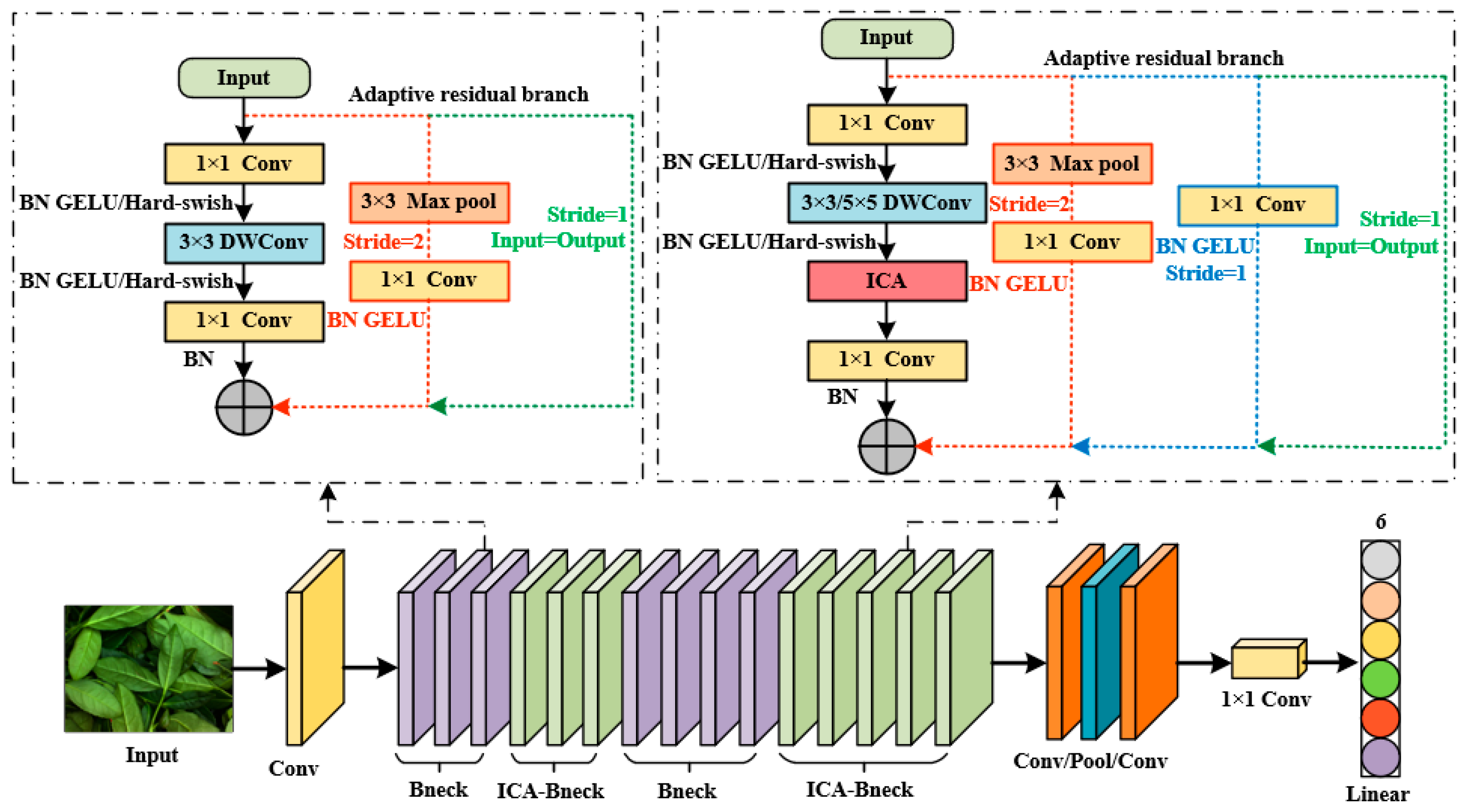 Adaptive residual learning: An adaptive residual branch is incorporated into the Bneck module, enabling effective feature fusion even when the numbers of input and output channels differ, thus preventing the loss of characteristic information across different green-making stages.