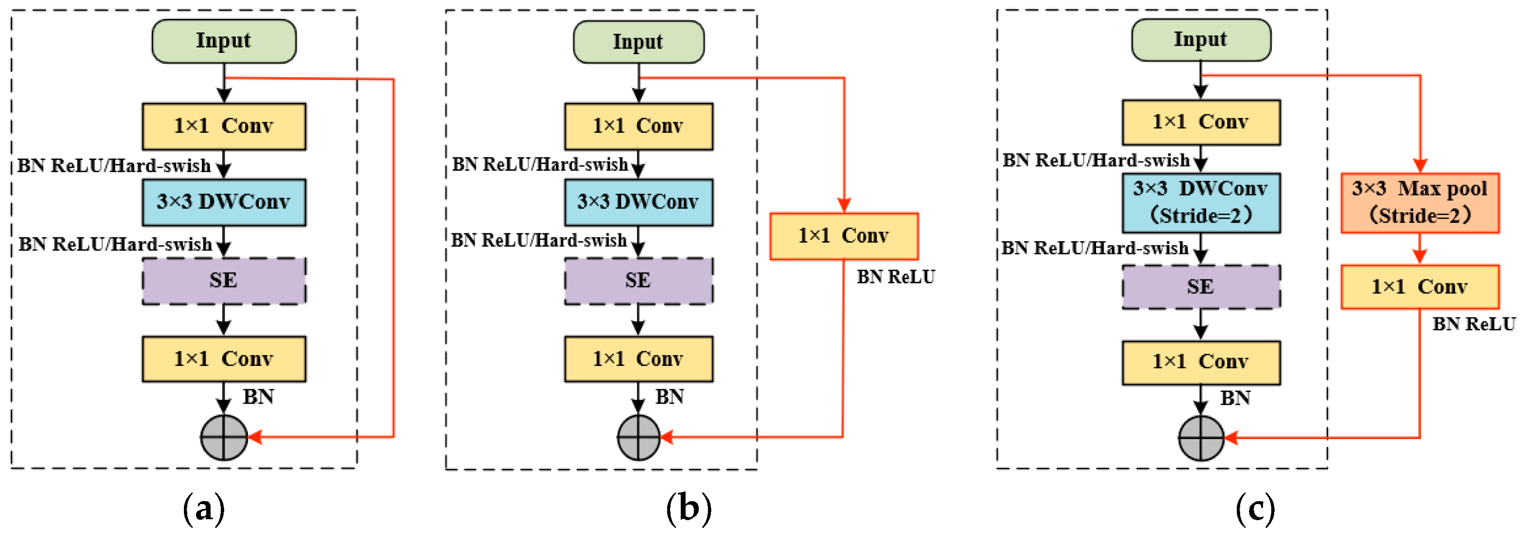 Figure 6b, when the stride is 1 but the channel numbers are inconsistent, an additional residual branch composed of a standard 1 × 1 convolution is incorporated on the right side of the Bneck module. This branch functions to adjust the channel dimensions to align with those of the main branch, thereby achieving effective linear feature combination and channel alignment without altering the spatial size of the feature maps.