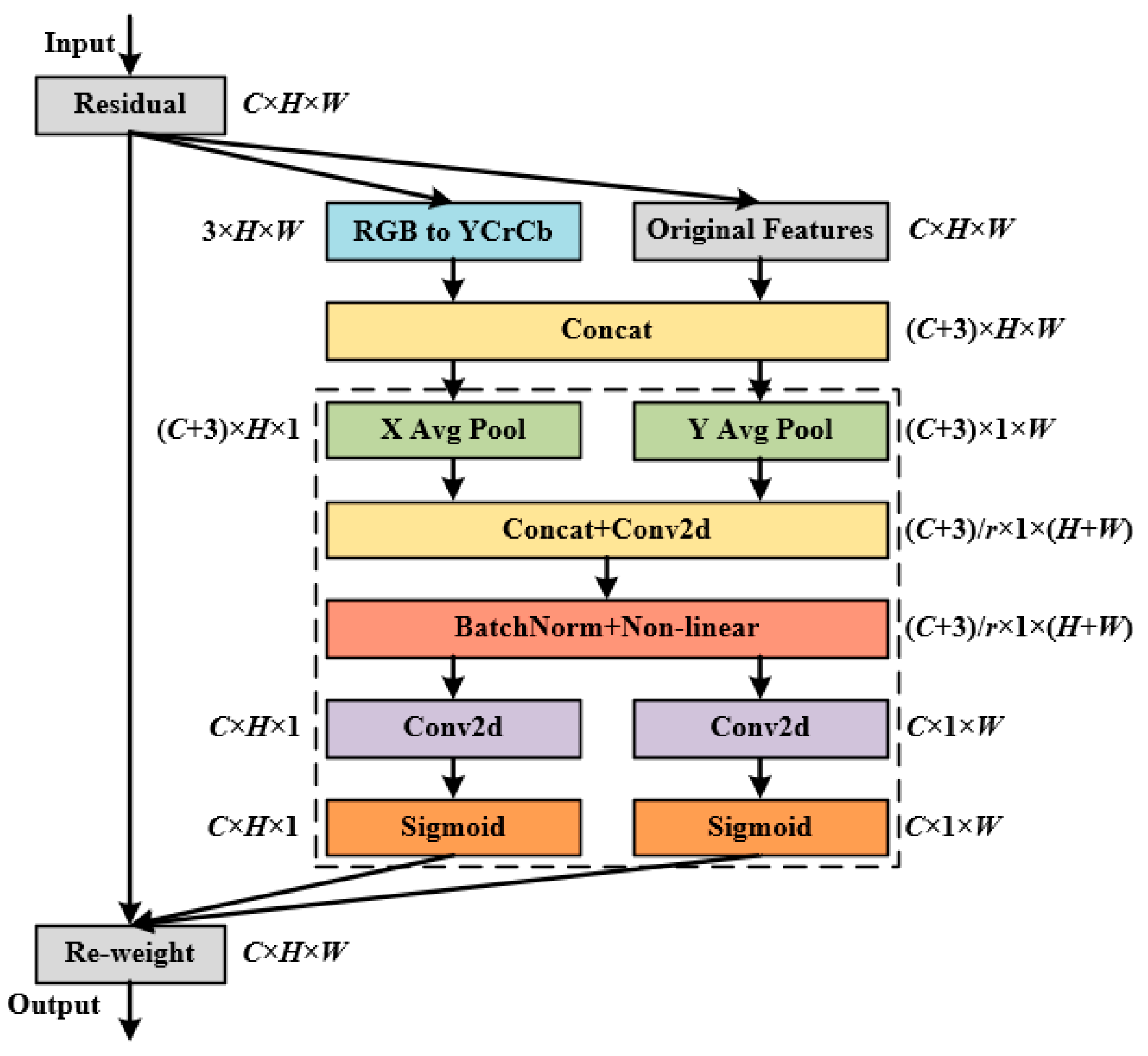 Multi-color space feature fusion: The input feature map with dimensions C × H × W (in RGB color space) is transformed into the YCrCb color space. In this space, the Y channel (luminance) effectively highlights illumination variations in tea leaves, which helps capture variations in illumination and shading on the tea leaf surface, while the Cr and Cb channels more effectively represent chromatic features in leaf blades and stems. Then, the converted YCrCb features are concatenated with the original RGB features along the channel dimension, yielding a feature map of size (C + 3) × H × W. By introducing color space features that decouple luminance from chrominance, this approach preserves the original color information while providing richer and more discriminative color feature representations for subsequent attention modeling.