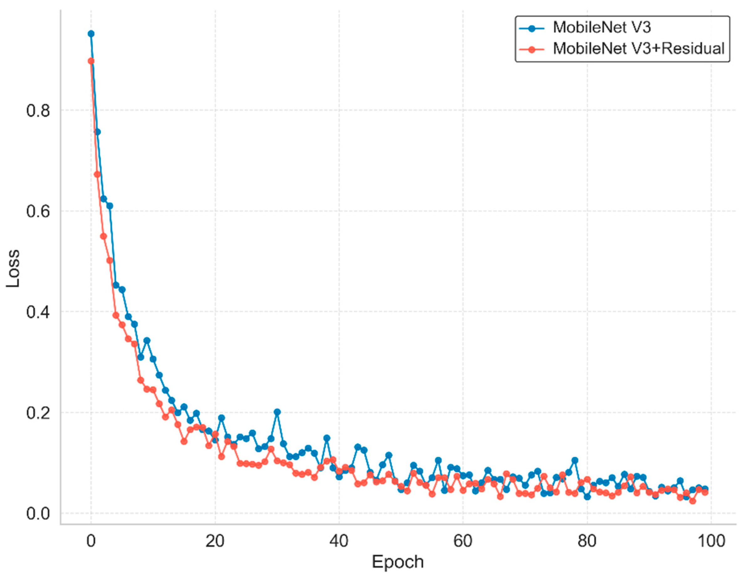 14] architecture. This foundation model was selected because it maintains a lightweight structure while offering powerful feature extraction capabilities, enabling it to effectively identify characteristic visual features of Tieguanyin tea leaves across different green-making stages, such as the “red-edged” appearance and the morphology of brown areas. Moreover, its high computational efficiency allows for potential deployment on mobile or embedded devices, thereby facilitating real-time intelligent management and broad application in the primary processing of Tieguanyin tea. The MobileNet V3 architecture has been widely adopted in tea image analysis tasks, such as tea disease identification [