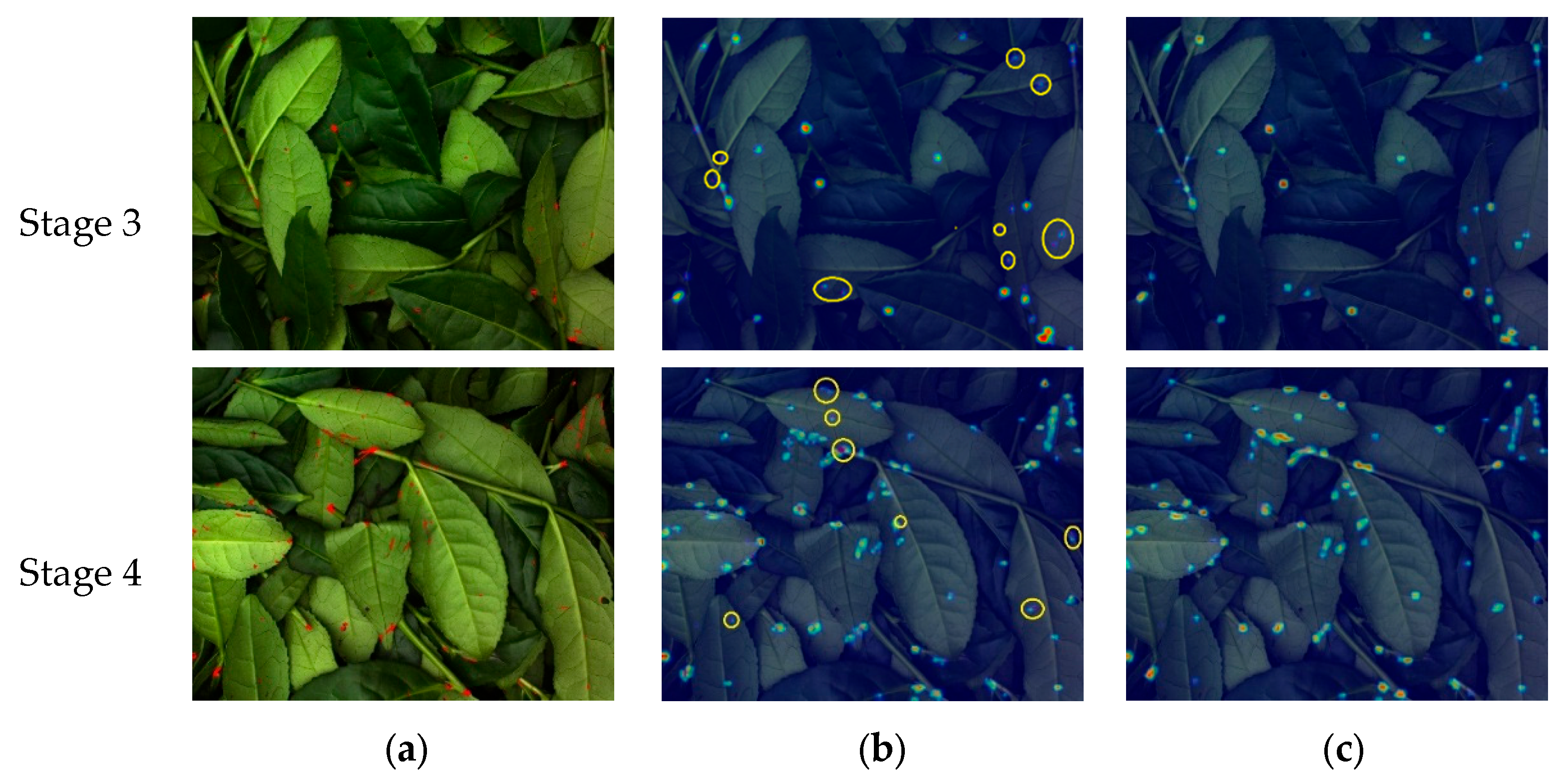 Figure 2, it can be observed that the brown spots on petioles and veins, as well as the “red edge” features on leaf edges, are significantly enhanced in the images of each green-making stage. Thus, the proposed preprocessing step effectively improves feature representation and reduces the complexity for the subsequent model.
