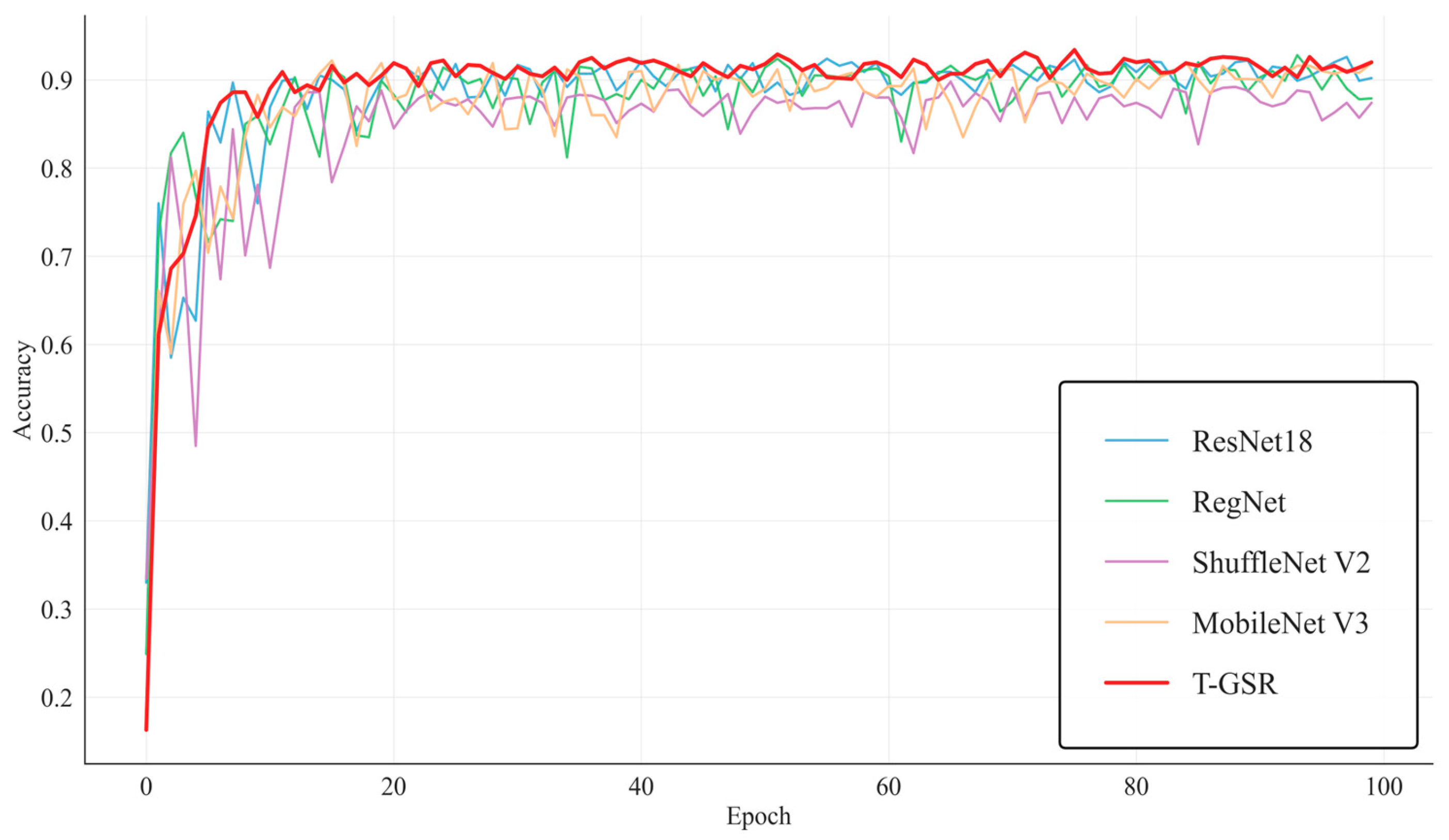 19]. To mitigate these limitations, this study introduced three key enhancements to the MobileNet V3 architecture. These improvements were designed to augment the model’s sensitivity to fine-grained characteristics of Tieguanyin tea during green-making, thereby boosting its generalization capability and classification accuracy while adhering to a lightweight design paradigm. The overall architecture of the proposed T-GSR model is depicted in
