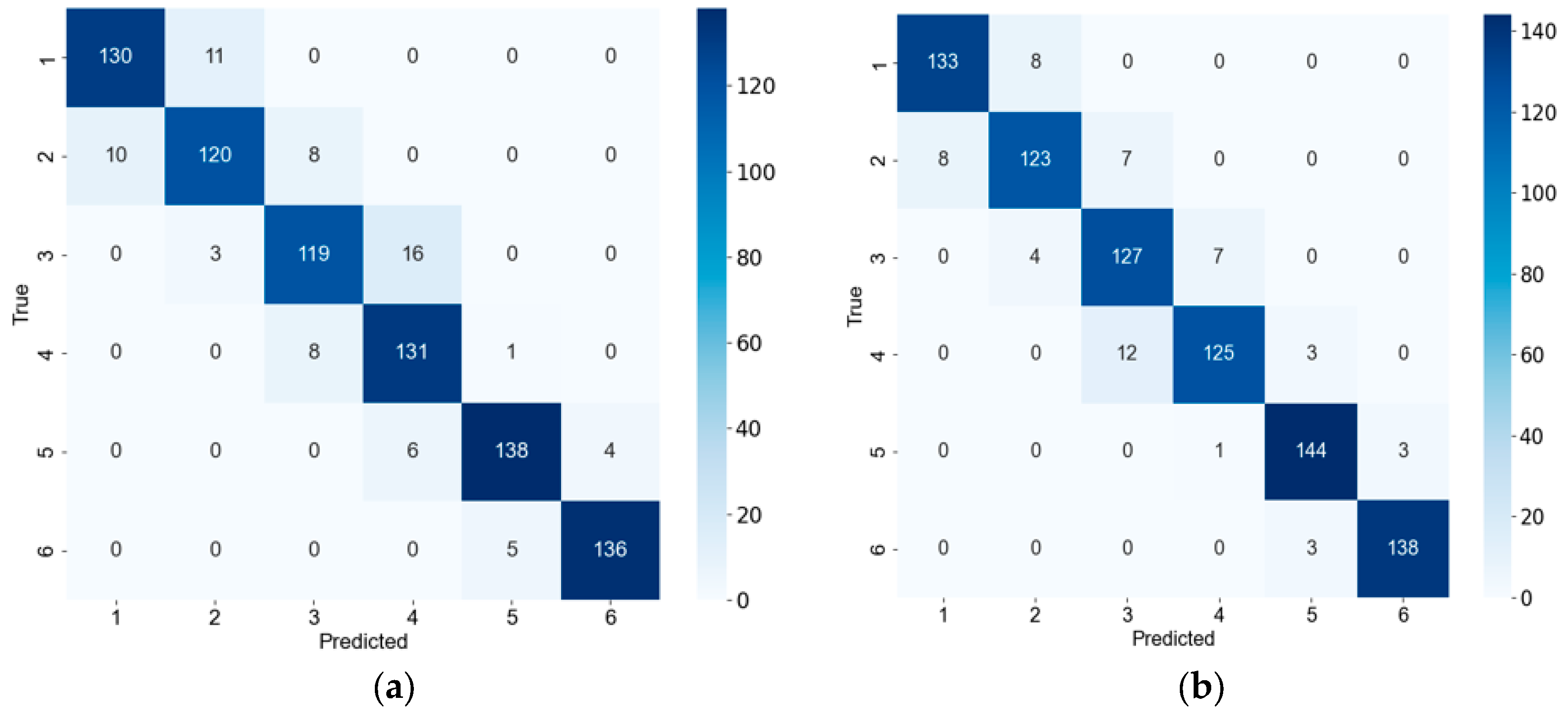 Confusion matrices of the test set: (a) RegNet model; (b) T-GSR model. Note: 1 represents Stage 1; 2 represents Stage 2; 3 represents Stage 3; 4 represents Stage 4; 5 represents Stage 5; 6 represents Stage 6.
