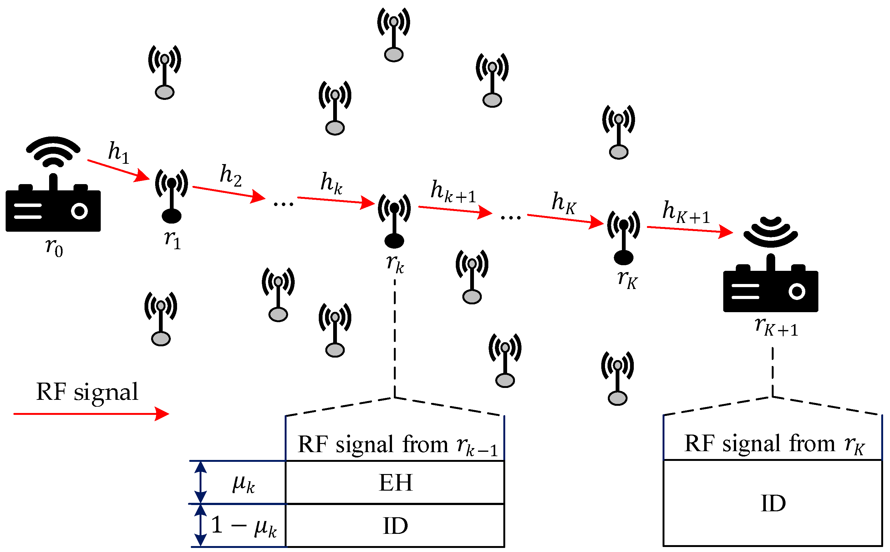 portion of the received RF signal via an EH circuit and stores it in a supercapacitor. All harvested energy is utilized for ID and retransmission. This paper assumes that the source node