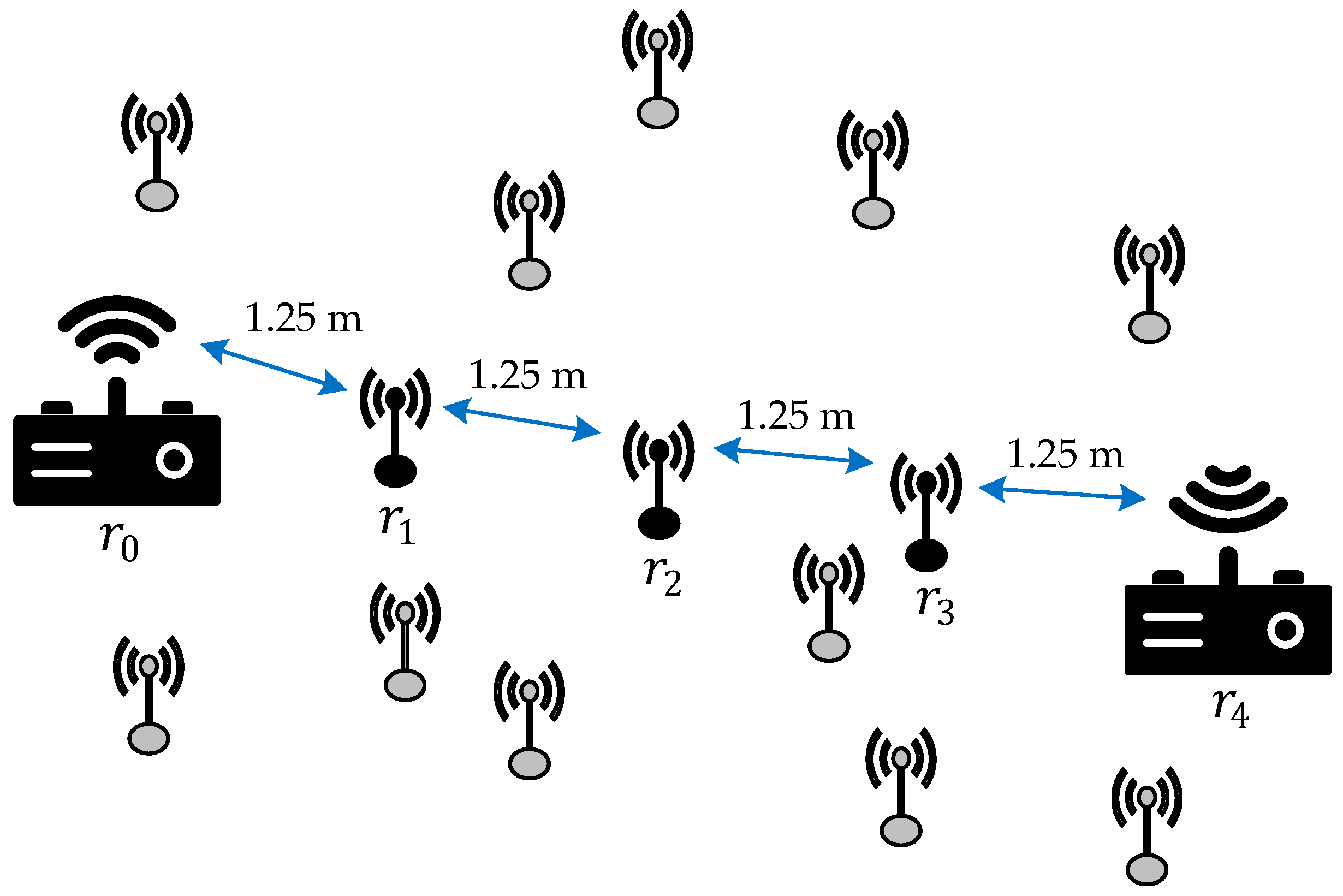 The channel model used in the simulations considers both large-scale fading and small-scale fading. For large-scale fading, the log-distance path loss model is adopted, with a path loss exponent set to 3.8, a carrier frequency of 2.4 GHz, and a reference distance of 1 m. Regarding the small-scale fading model, we adopt Rician fading to accurately represent the propagation environment. Given that the relays are typically deployed in proximity within controlled settings (e.g., industrial halls), a strong LoS path is expected between communicating nodes. Therefore, the channel gain , , is modeled as follows: a Rician distribution with a K-factor of 7, representing a dominant LoS component relative to the scattered multipath components. The channel gains are modeled as independent Rician variables to isolate the effects of multi-hop resource allocation. While this assumes ideal uncorrelated conditions, it provides a baseline for evaluating the proposed schemes; correlated channels would require additional analysis beyond the scope of this paper.