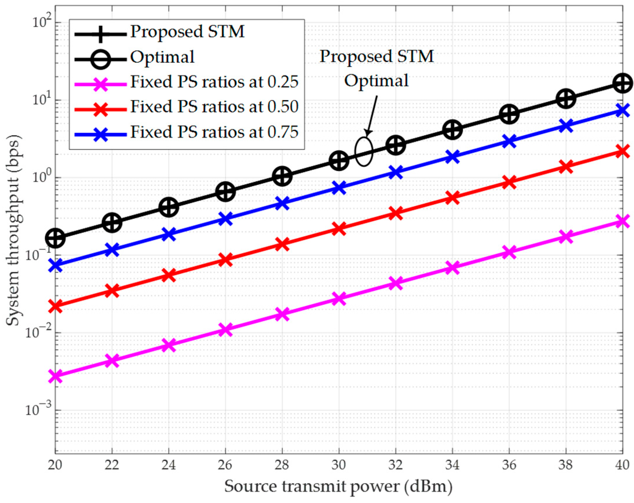 Section 3.1 coincides with that of the exhaustive search-based scheme. This consistency is also observed under other parameter settings, demonstrating that the proposed scheme achieves optimal throughput performance. On the other hand, the proposed scheme significantly outperforms the three suboptimal schemes with fixed PS ratios in terms of throughput. For instance, the results indicate that the average throughput of the proposed scheme is 123% higher than that of the scheme with fixed PS ratios of 0.75. This notable advantage persists even when the fixed PS ratios are set to other values.