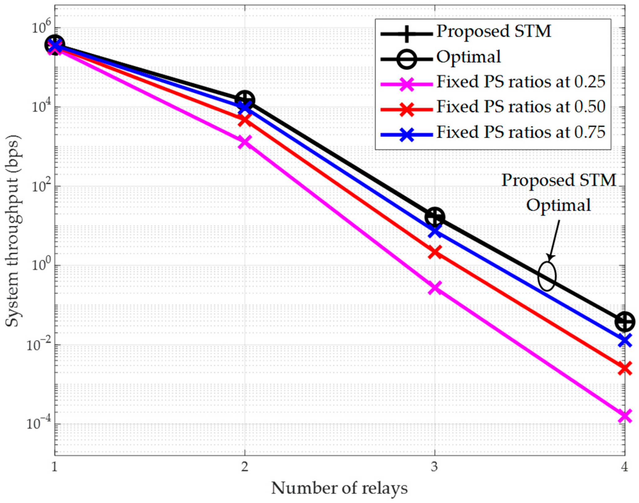 Section 3.1, achieves optimal performance, and its throughput surpasses that of the suboptimal schemes with fixed PS ratios. For instance, when the number of relays is