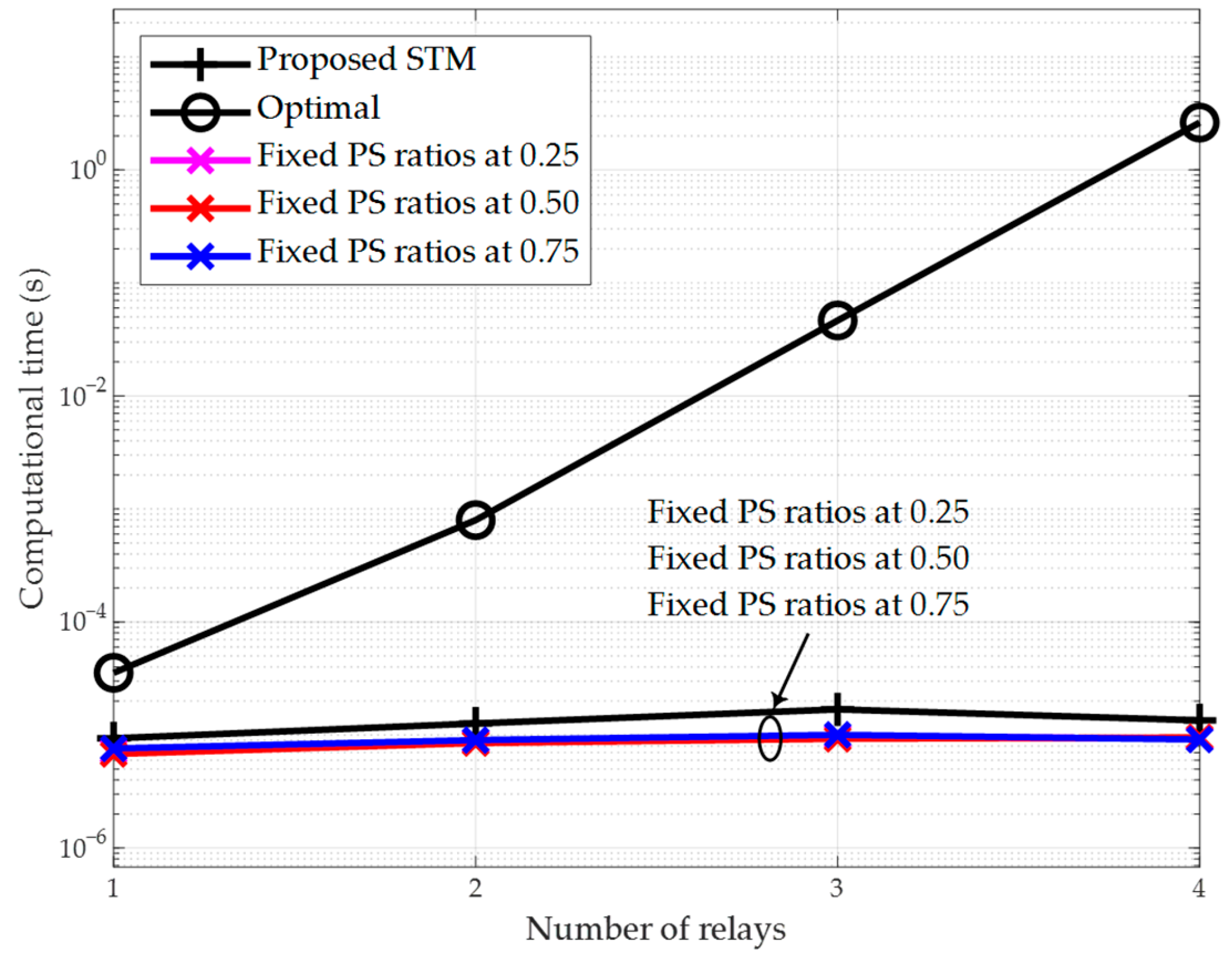 Figure 6, we evaluate the performance of the proposed STM scheme from the perspective of computational efficiency. For this purpose, we measure the computational time of all schemes. The transmit power of the source node is set to