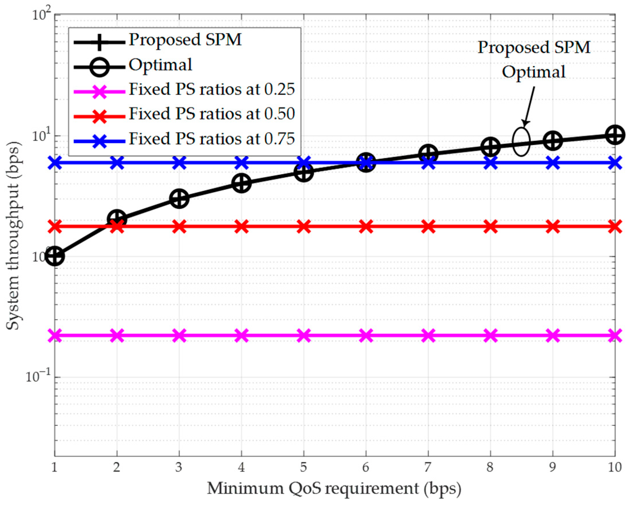 , resulting in a hop distance of 1.25 m. The minimum QoS requirement varies from 1 bps to 10 bps. The results show that the proposed SPM scheme and the exhaustive search-based optimal scheme achieve identical performance, confirming the optimality of the former. Furthermore, it can be observed that the throughput of the proposed scheme meets and equals the minimum QoS requirement. In contrast, the throughput of the three schemes with fixed PS ratios and fixed source node transmit power remains constant regardless of the minimum QoS requirement. Although the suboptimal schemes with fixed PS ratios of 0.5 and 0.75 exhibit higher throughput than the proposed scheme when