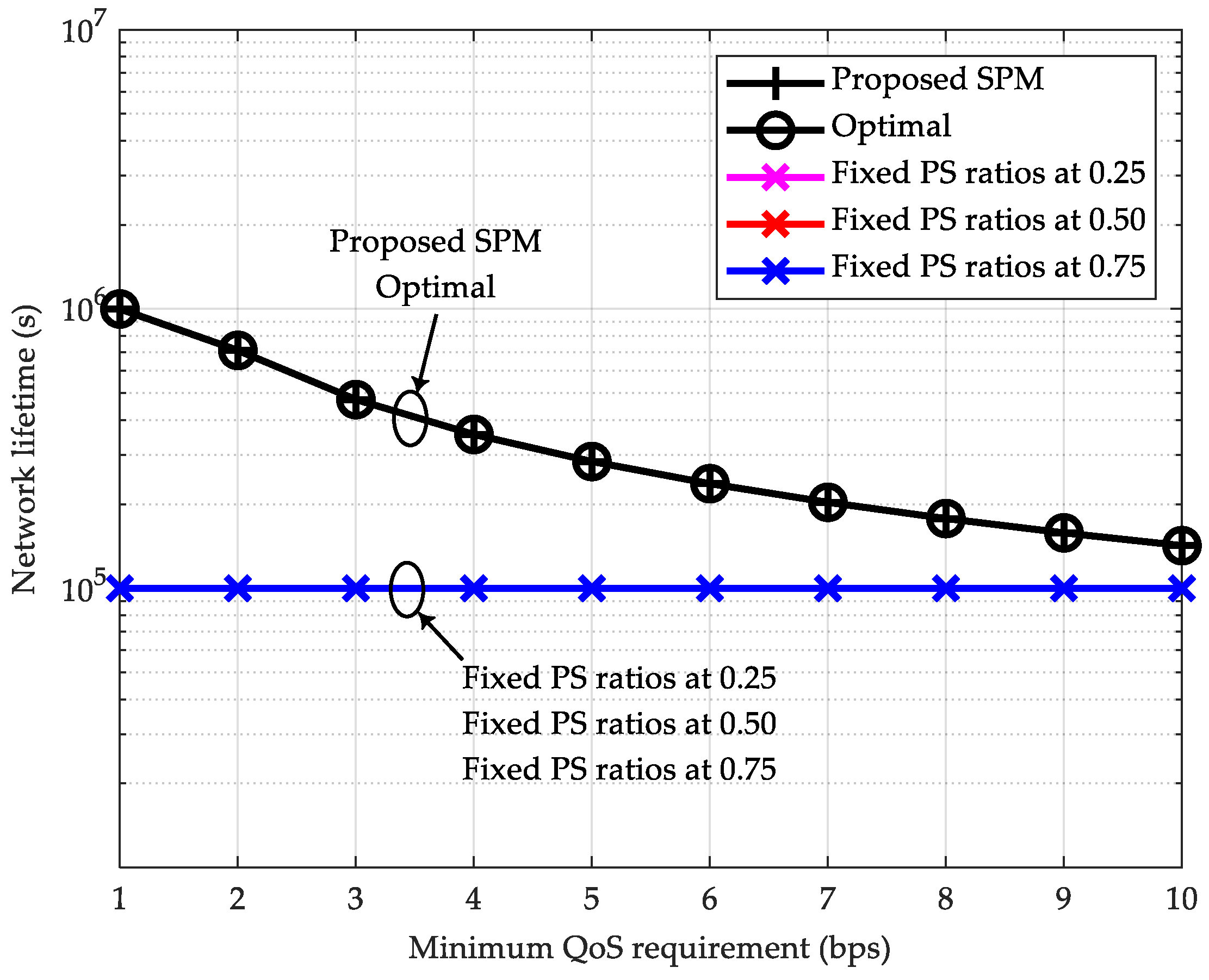 s, which are 10 times and 1.42 times that of the three fixed PS ratio schemes, respectively. Although the network lifetime of the proposed SPM scheme decreases as the minimum QoS requirement increases, it simultaneously guarantees the minimum QoS requirement, which the three fixed PS ratio schemes fail to achieve.