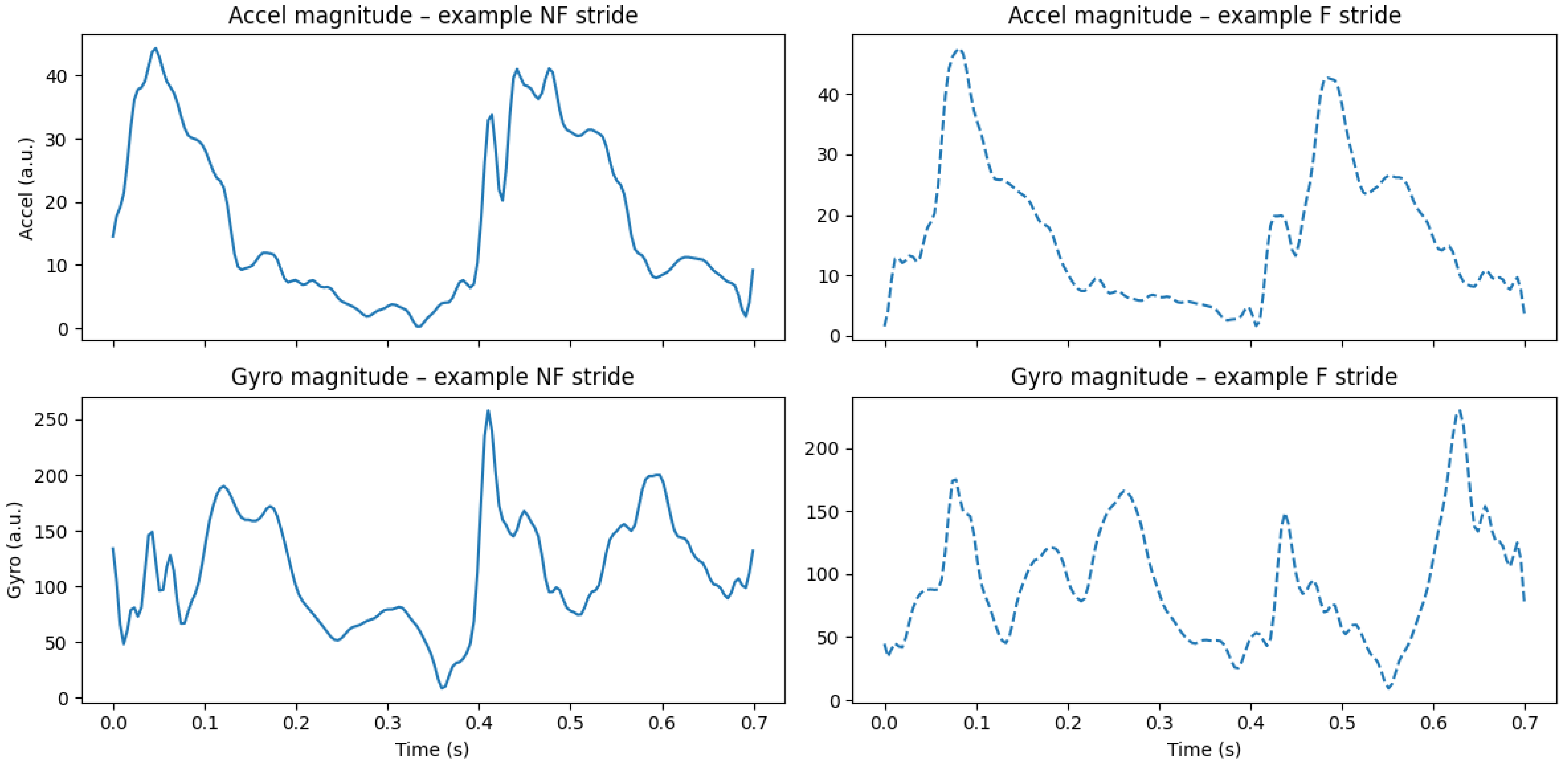 4]. In particular, inertial measurement units (IMUs) provide a lightweight, low-cost solution for acquiring multi-axis acceleration and gyroscope data in uncontrolled environments, enabling detailed stride-level biomechanical analysis (see