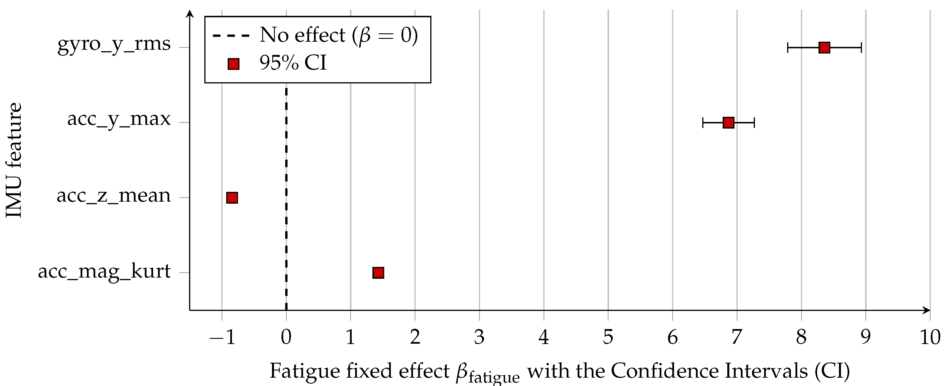 Figure 5 presents the corresponding confidence intervals and statistical uncertainty. The vertical acceleration mean (acc_z_mean) shows a strong negative shift under fatigue, while acc_mag_kurt, acc_y_max and gyro_y_rms exhibit positive fatigue effects, indicating sharper impact peaks, higher mediolateral acceleration, and greater lateral trunk rotation, respectively. All confidence intervals lie well away from zero, confirming the robustness of these fatigue-induced changes.
