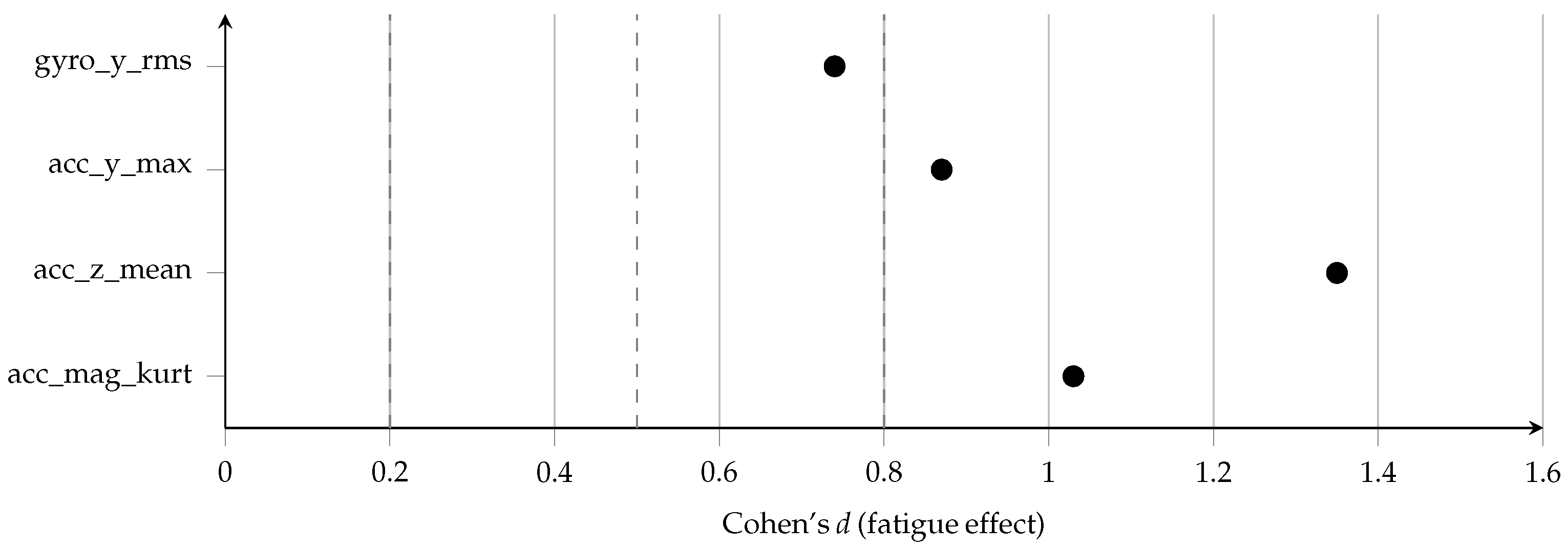 d values for the fixed effect of fatigue were large across all four representative features, with the strongest effect for acc_z_mean. The corresponding partial