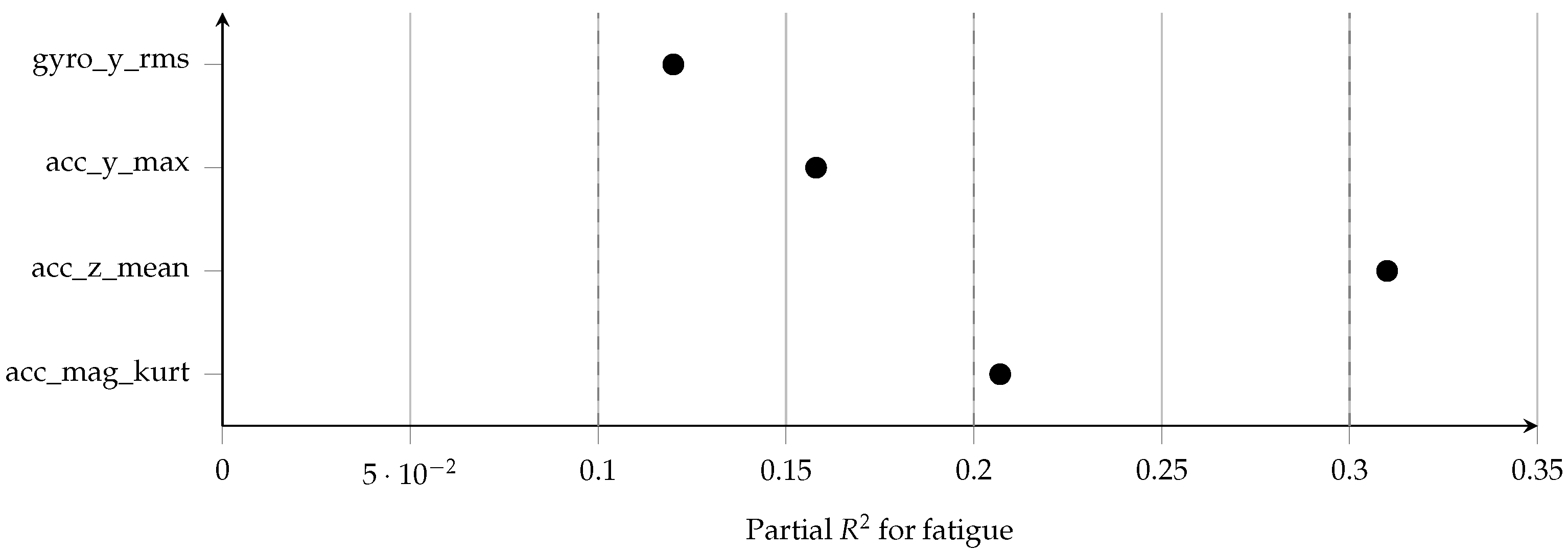 values (0.12–0.31) further demonstrate that fatigue explains a non-trivial proportion of variance in IMU features even after accounting for participant-level random effects. These results reinforce the robustness of the fatigue signatures detected by the mixed-effects models and justify the use of these features in downstream machine learning pipelines.