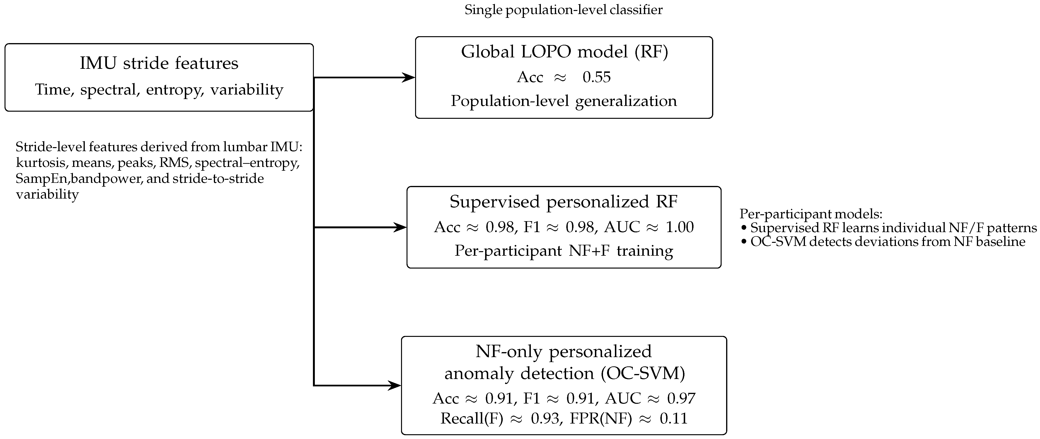 11]. Mixed-effects modeling provides a principled statistical approach for evaluating the fixed effect of fatigue while accounting for random differences between participants. Complementing this statistical framework, hybrid ML approaches—including Random Forests (RFs), Support Vector Machines (SVM), Gradient Boosting (GB), and shallow one-dimensional Convolutional Neural Networks (1D-CNNs)—offer robust classification performance using both handcrafted features and raw stride waveforms. Personalized models, such as supervised subject-specific classifiers and anomaly detectors trained on non-fatigued (NF) data only, further enhance sensitivity to individual fatigue signatures.