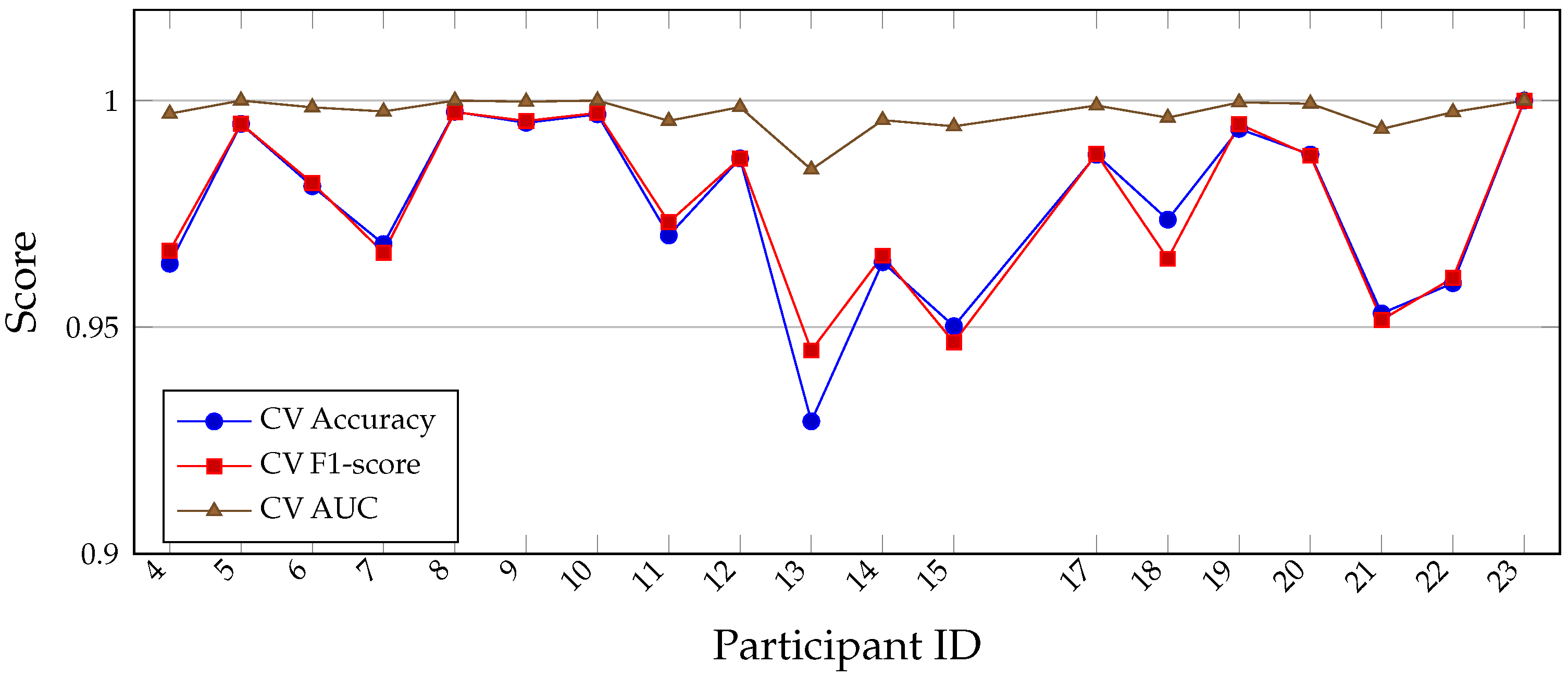 Figure 11) performance of the supervised personalized Random Forest (RF) models. For each participant, a RF classifier is trained and evaluated using stratified K-fold cross-validation on that runner’s own NF and fatigued (F) strides.