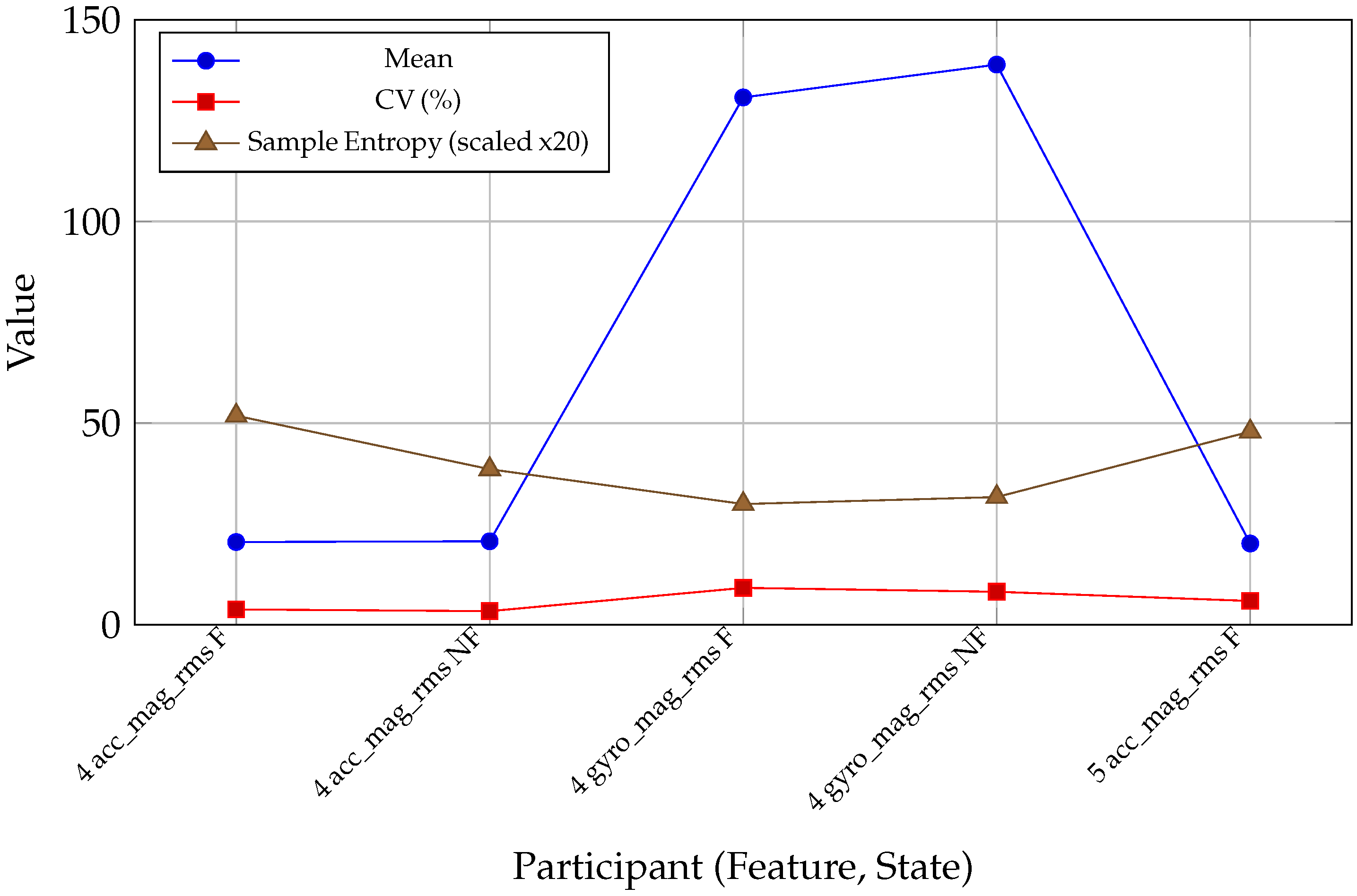 48]. Across participants, fatigued strides generally exhibited higher variance and coefficient of variation (CV) in both acc_mag_rms and gyro_mag_rms, indicating less stable trunk acceleration and rotational control. SampEn, which quantifies temporal irregularity of feature trajectories, also tended to increase under fatigue for acc_mag_rms, suggesting less predictable stride-to-stride structure. Gyroscope-based SampEn changes were more participant-specific, consistent with individual strategies of compensatory stabilization during fatigue. These findings align with biomechanical theory: fatigue degrades neuromuscular control, leading to more variable and less regular stride patterns.