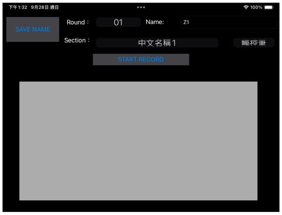 Two custom handwriting capture applications were developed for each platform (iOS and Android) to record the signatures. The apps provided a uniform writing canvas (approximately postcard-sized on each tablet screen) with coordinate systems calibrated to each screen’s resolution. For example, on the iPad mini, the writing area corresponded to a physical size of approximately 100 × 50 mm on screen, with a pixel resolution of about 1280 × 640 for data capture. The section (writing type) is “Chinese Name 1” with a “stylus”, as shown in Figure 1. The sampling rate for the stylus signals was approximately 100 Hz on the iPad devices (the iPad Pro with ProMotion could sample at up to 120 Hz, while the iPad Mini was limited to 60–120 Hz, depending on the model), and similarly around 60–100 Hz on the Samsung tablet. Each recorded sample (signature) was saved as a time-series data file containing sequential records of the pen position and other parameters. Table 1 (below) outlines the typical data format and units, consistent with ISO/IEC 19794-7:2021 [2]: for each sampled point in time, the X coordinate, Y coordinate, the altitude angle, and the azimuth angle of the pen tip on the screen (in device-specific units or normalized units) were stored, along with the pressure level (a dimensionless unit from the device’s API, typically ranging 0 to a maximum value such as 1.0 or 4095), and a timestamp or sample index.