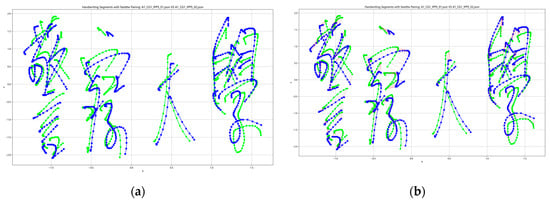 An example of aligning a pair of Chinese characters before and after alignment by FastDTW, the green lines mean the first time handwriting sample, and the blue lines mean the second one: (a) Before alignment; (b) The red lines mean the aligned pairs after alignment.