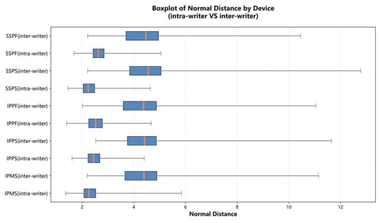 Then, the differences between writing on the same device and writing across devices were evaluated. Table 9 shows the average distance between writing on the same device and writing across devices. According to Table 9, the average distances that are written across devices are larger than those written on the same device. To determine the difference between writing on the same device and across devices, Levene’s test and the Z-test are used to obtain the statistical significance (Table 10).
