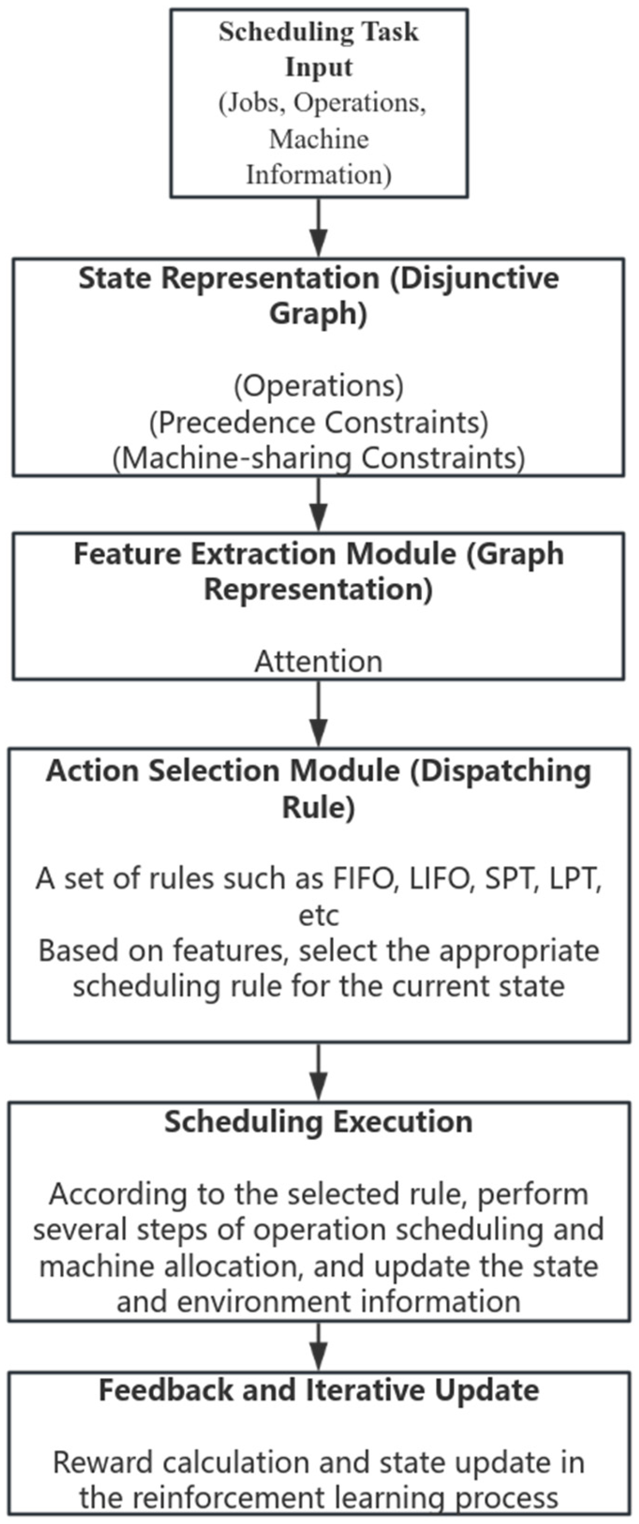 Action selection module: The general dispatching rules (such as FIFO, LIFO, SPT, LPT, etc.) are adopted as the action space. According to the results of graph feature extraction, the most suitable dispatching rules for the current state are dynamically selected to balance the efficiency and interpretability of decision-making.