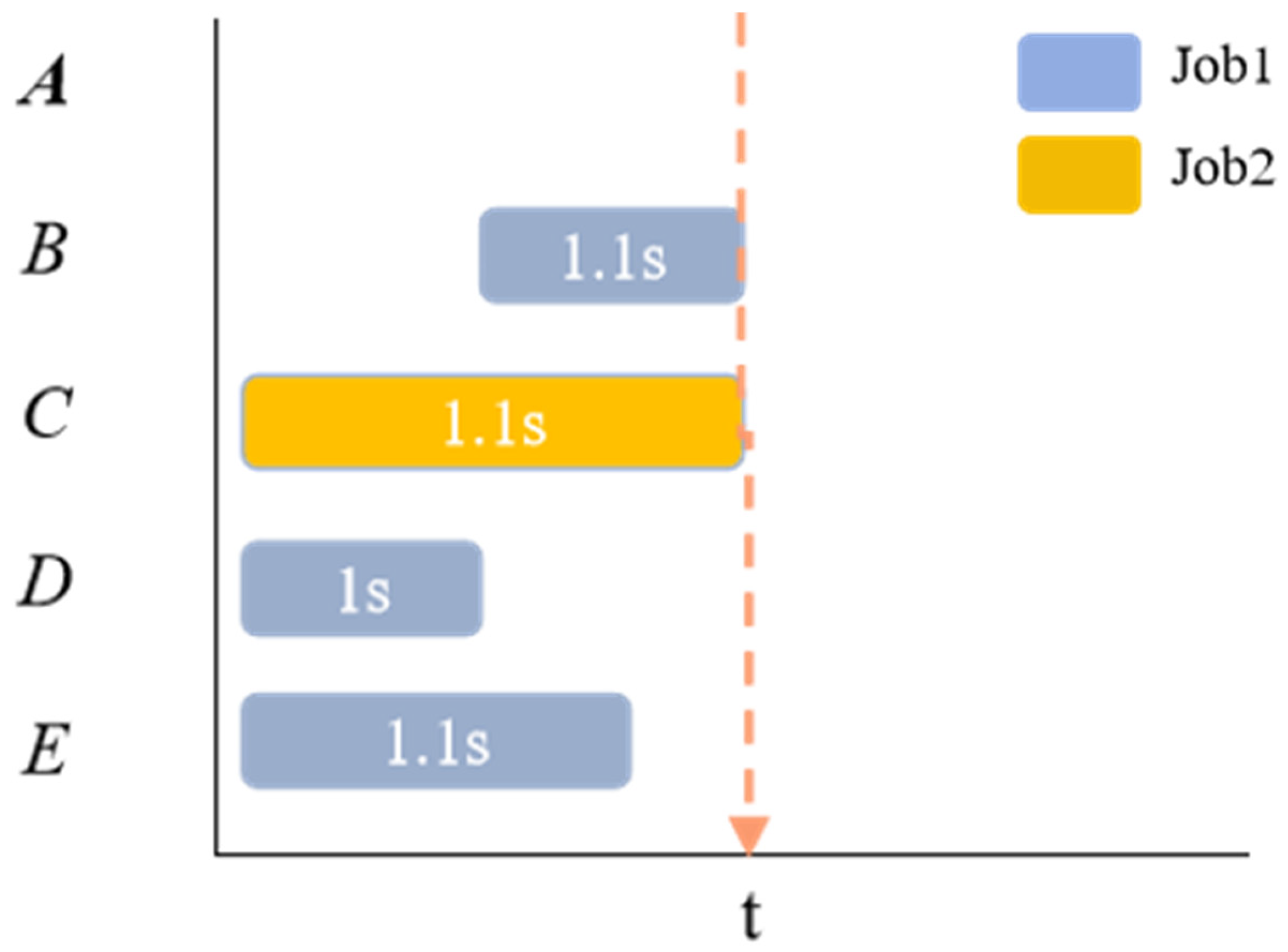 Figure 5 below, there are five processing machines numbered A–E. At time t, MIF prioritizes the process that can be processed on machine A for arrangement, while LIF prioritizes the process that can be processed on machine C for arrangement.
