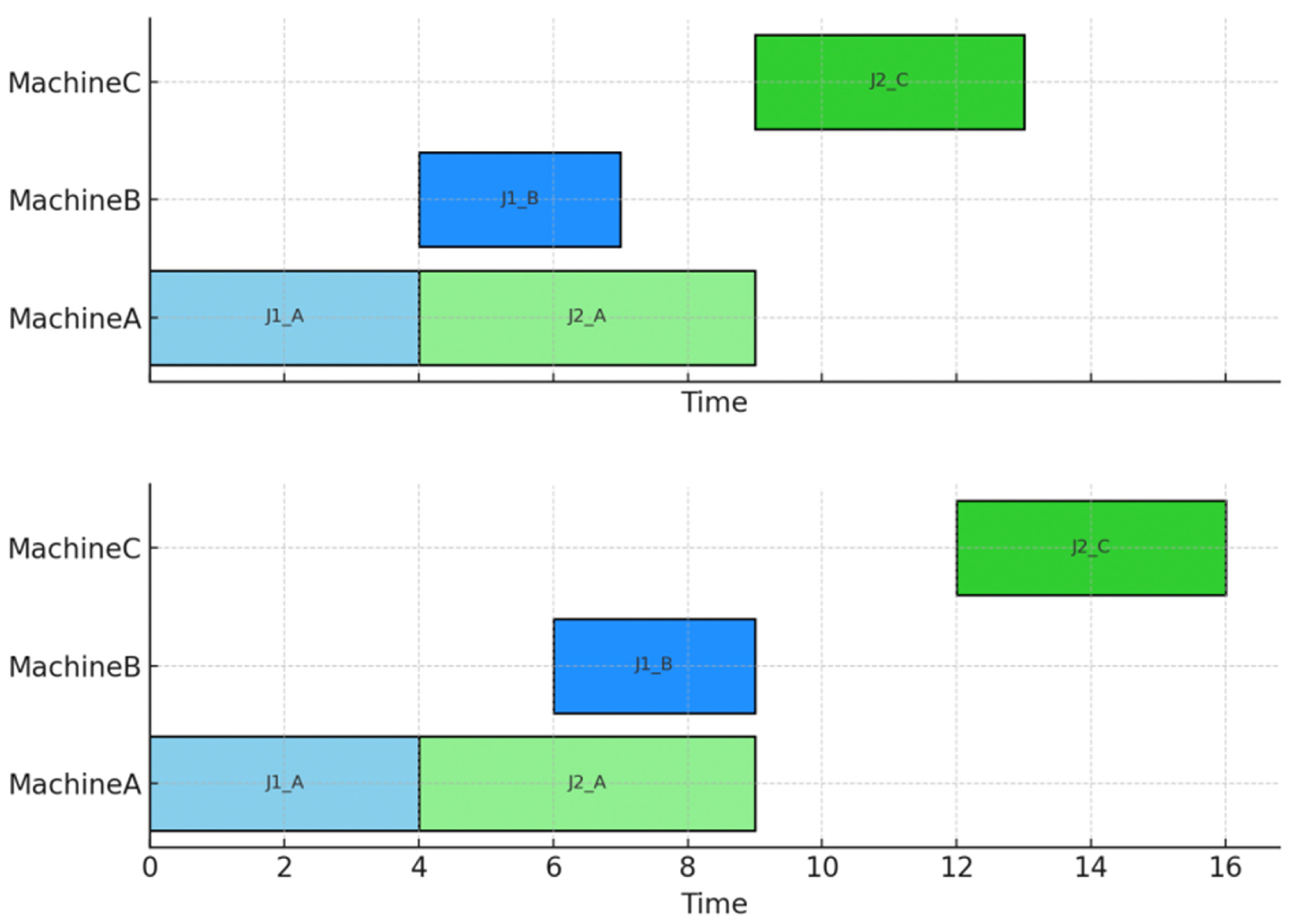 Figure 7 demonstrates the comparison between traditional scheduling results and the preprocessing method proposed in this study. The upper chart shows a conventional Gantt chart that ignores transportation processes, where workpieces are immediately processed on the next machine after completing the previous step. However, in real-world production environments, workpieces require transportation to reach target equipment, making such scheduling unrealistic in practice. The lower chart presents the preprocessed Gantt chart generated by our method, which explicitly incorporates transportation time and resource constraints between processes. For instance, after MachineA completes processing of workpiece J1, its path planned by the PBS algorithm requires 2 time units to reach Machine B, causing subsequent processing tasks to be delayed accordingly. Similarly, the transportation process between MachineA and MachineC for workpiece J2 takes 3 time units, pushing subsequent processing tasks to time point 12. This demonstrates that our method effectively addresses the issue of unreasonable process sequencing caused by traditional scheduling ignoring transportation, generating scheduling solutions that better align with practical execution conditions. This preprocessing mechanism lays the foundation for integrated optimization of path planning and scheduling in subsequent stages.