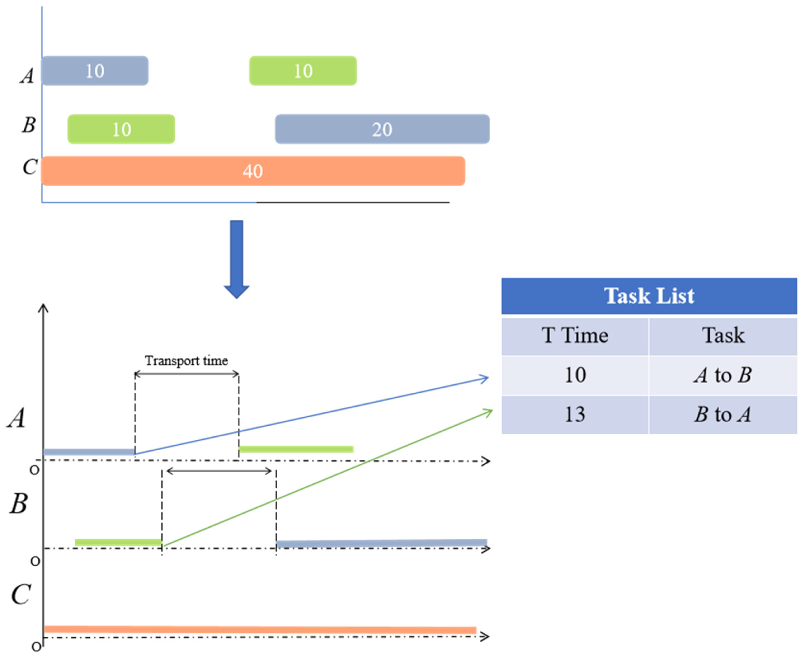 Traditional approaches only assign processing sequences and machine assignments at the scheduling layer without explicitly outputting transportation tasks. This results in the path layer struggling to inherit scheduling outcomes and align with the timeline, often leading to “disconnection between transportation and machining” during execution phases. To address this, we need to automatically and systematically extract transportation tasks from the obtained Gantt chart as input for the PBS algorithm, ensuring precise spatiotemporal correspondence between path planning and scheduling.
