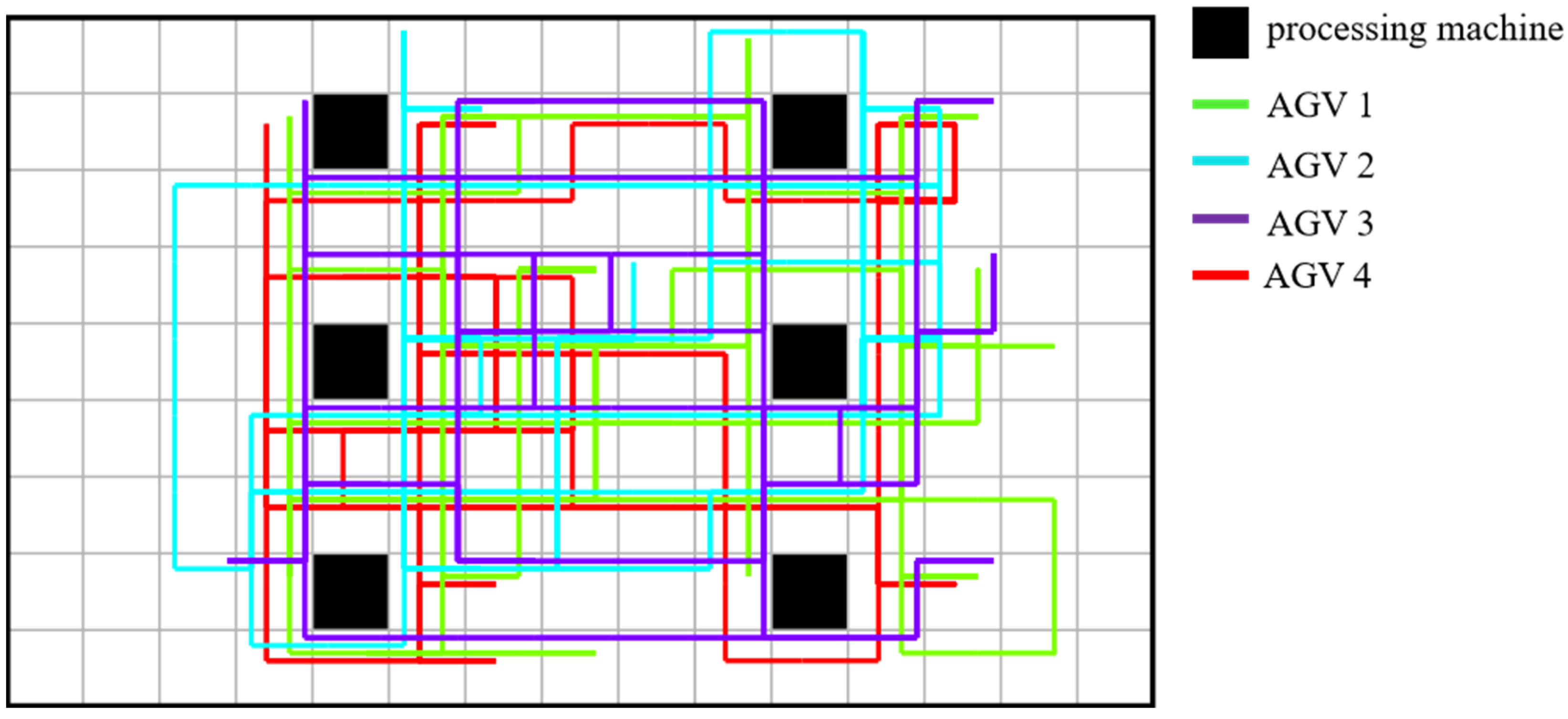 Each AGV is assigned a fixed initial position and operates in time units defined as time steps, during which it can either remain stationary or move to adjacent nodes. The system must specify the AGV’s transportation routes and durations for each process, along with determining the processing start times for each operation. The joint optimization problem proposed in this paper requires simultaneous decision-making across multiple processes:
