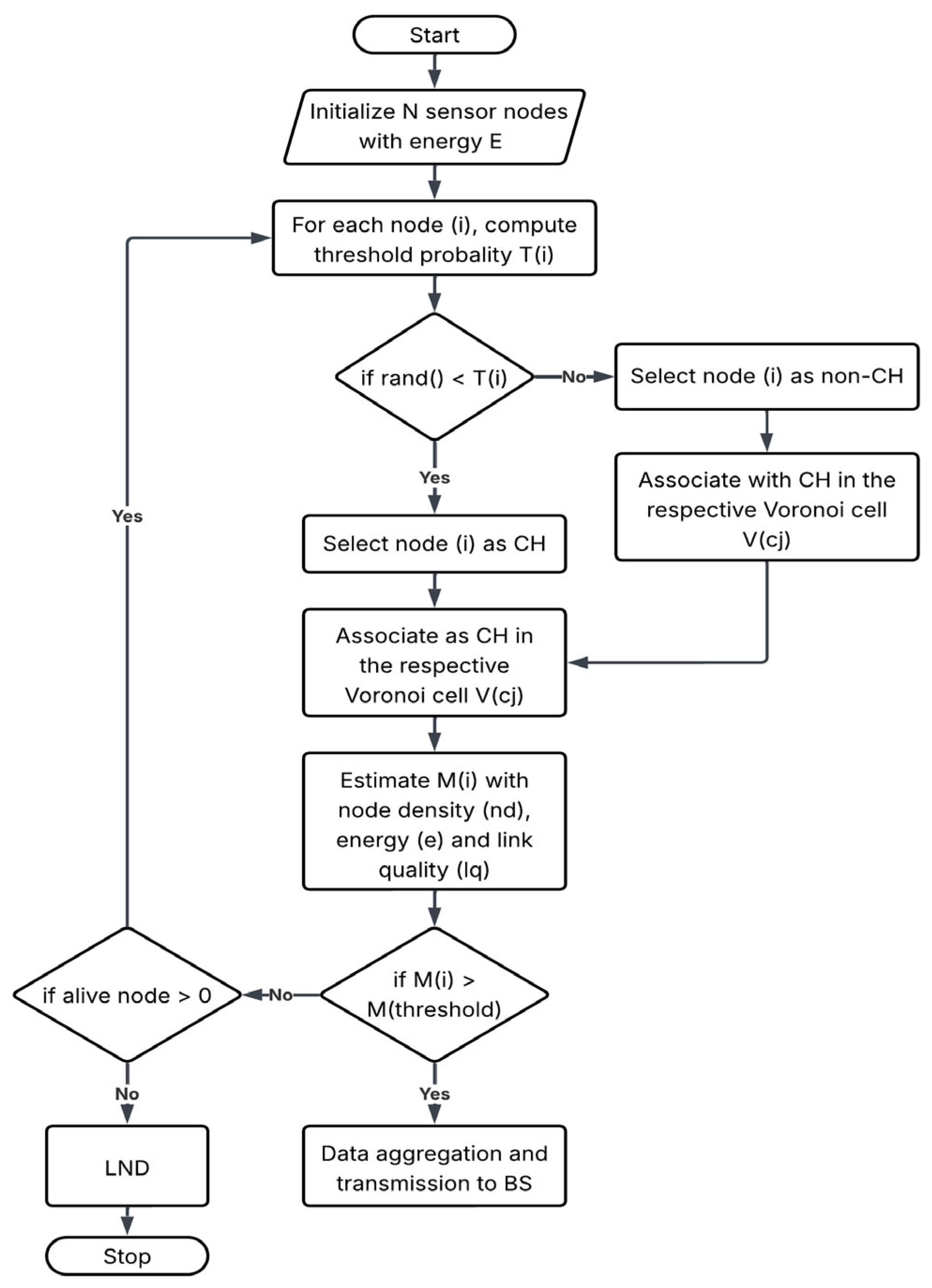 - Cluster heads are selected using a composite metric that combines residual energy and link quality, along with the active node density in the network which is estimated on each round.