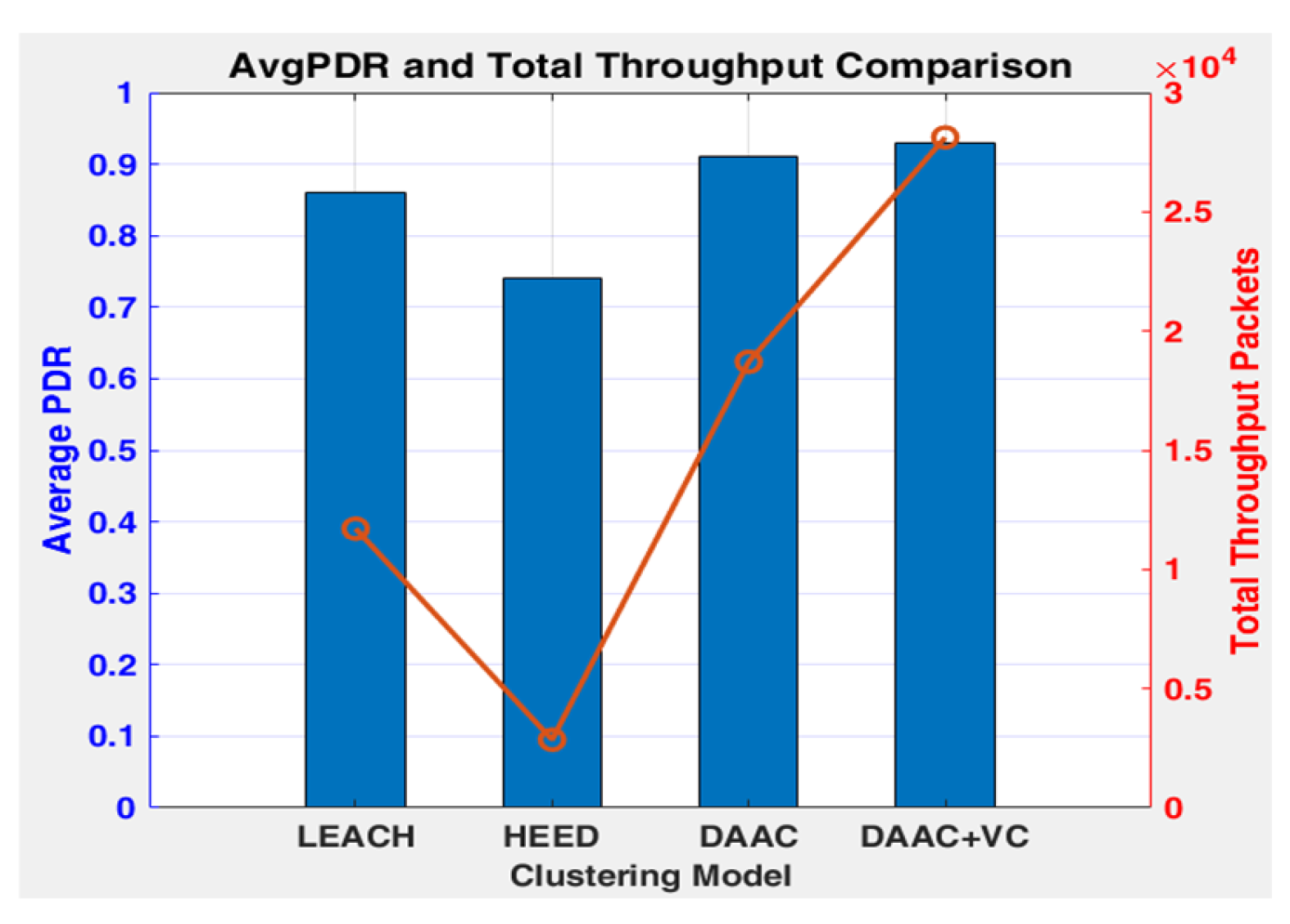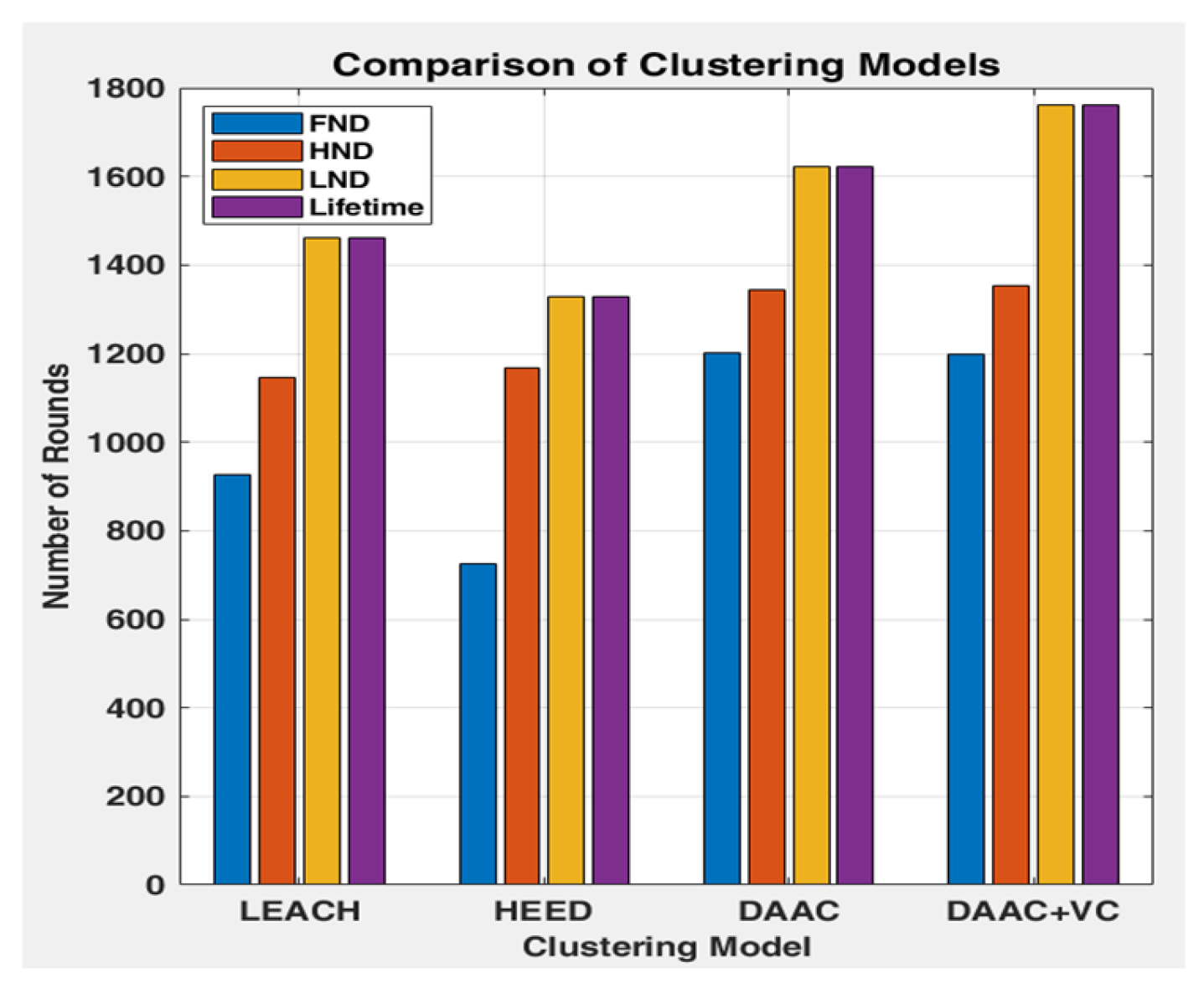 | Clustering Model | FND | HND | LND | Lifetime | Avg. PDR | Total Throughput Packets |
