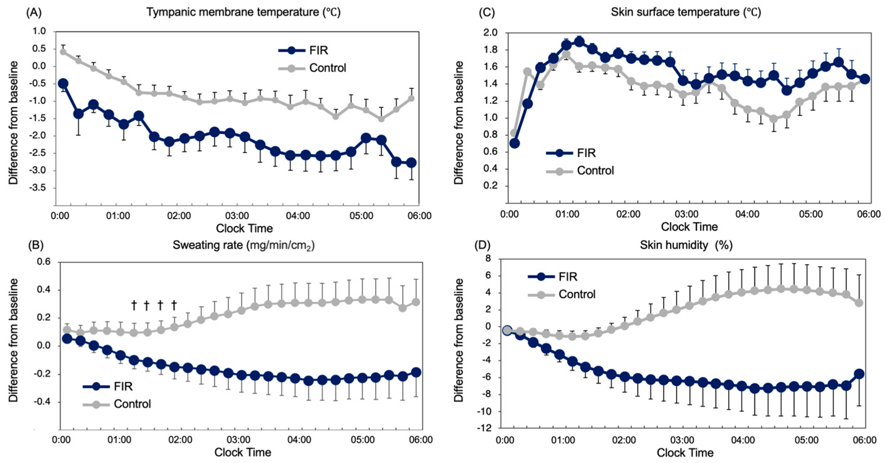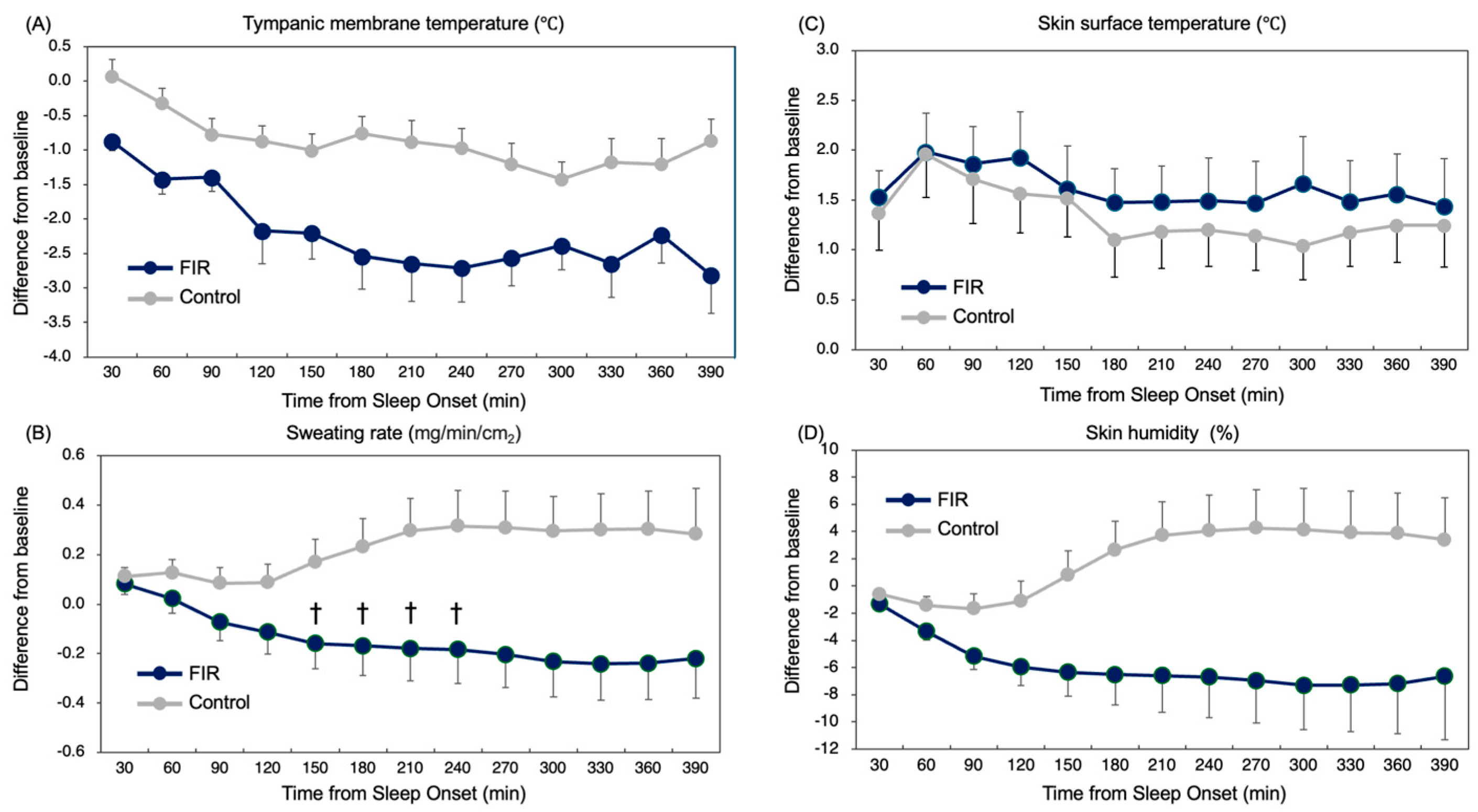 - FIR garments modestly enhanced nocturnal heat dissipation, reflected by lower tympanic temperature and reduced sweating during the mid-sleep period.