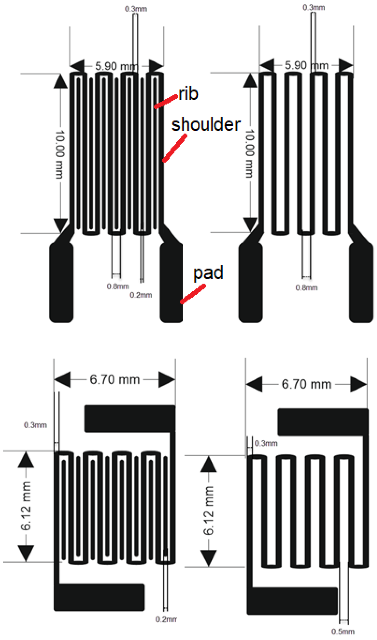 22]. The primary role of the ribs is to act as structural supports that limit excessive or unpredictable mechanical deformation of the sensor structure during strain cycles. By integrating these features, especially in flexible or textile-based sensors, the ribs help maintain the overall geometry of the sensor when it is bent, stretched, or compressed. This physical confinement prevents the meander wires from buckling or moving excessively out of plane, which would otherwise lead to unstable resistance readings, which is not due to the cortisol concentration change, thus preventing measurement error when wearing.
