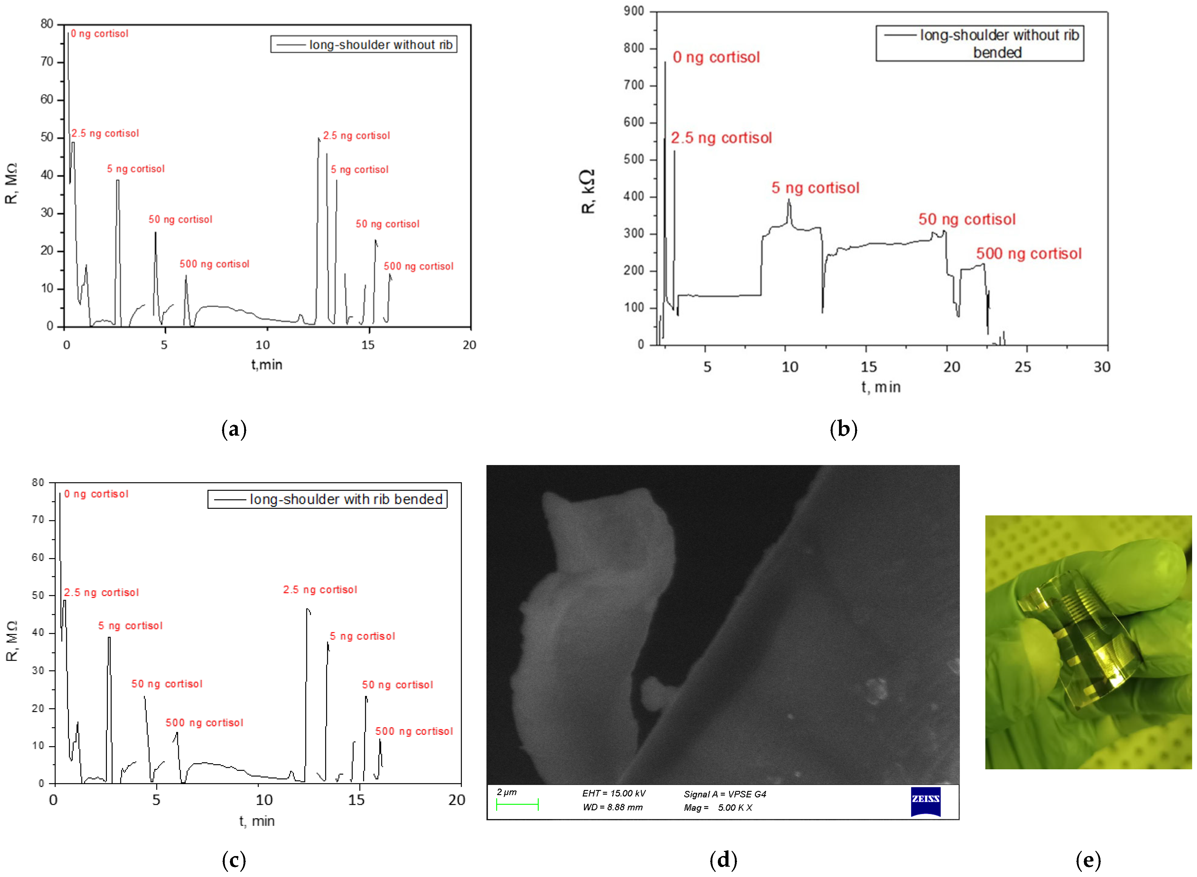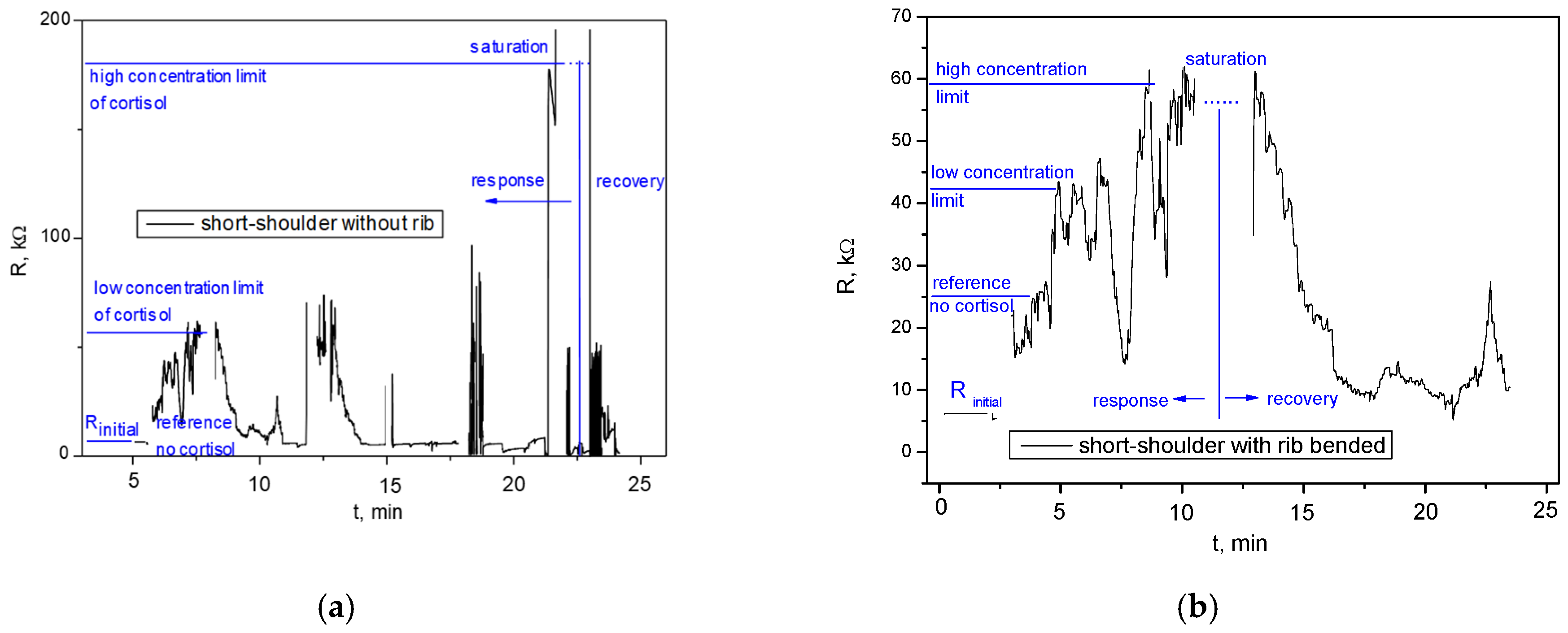 Figure 5a shows the resistance over time for a short-shoulder sensor without integrated ribs, after being subjected to bending stress. The signal is noisy and erratic. While approximate high concentration limit, low concentration limit, saturation, and recovery are indicated, the signal fluctuations are so significant that it is difficult to reliably distinguish these states or specific quantitative responses to cortisol concentrations. For the short-shoulder topology, the susceptibility to mechanical degradation appears to be particularly pronounced, leading to an almost complete loss of reliable sensing function.