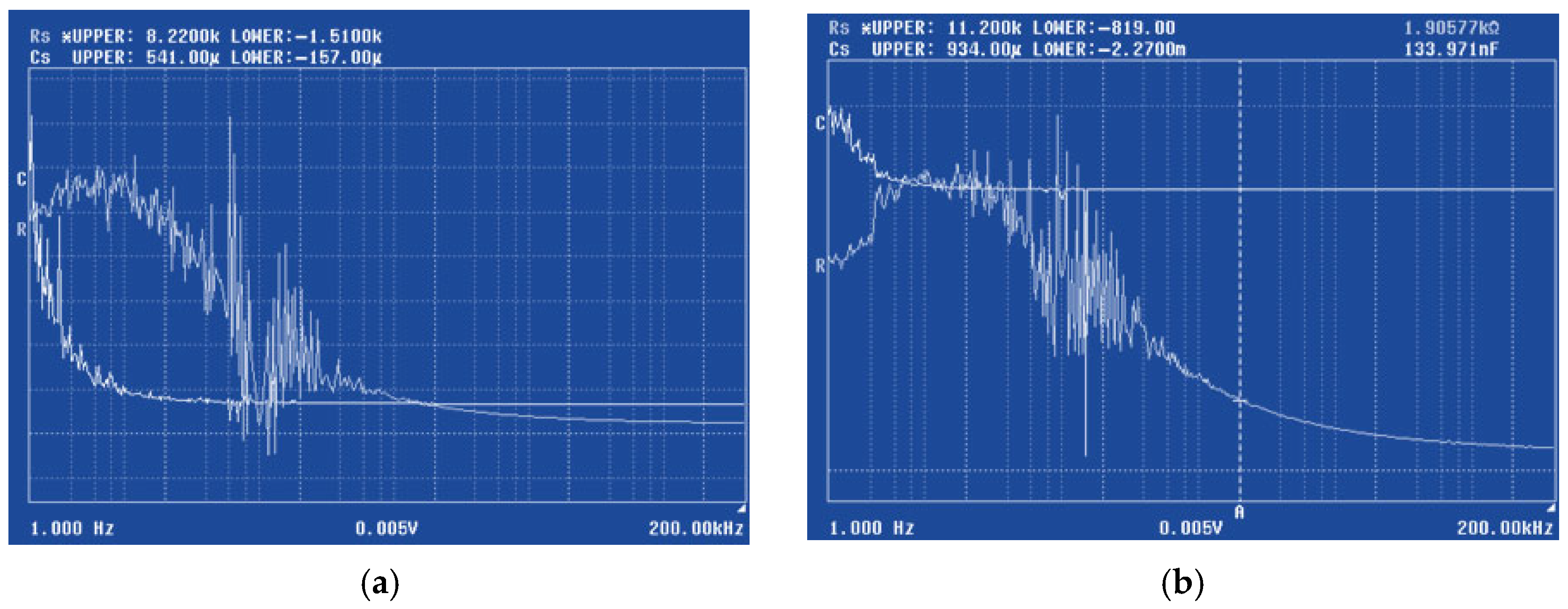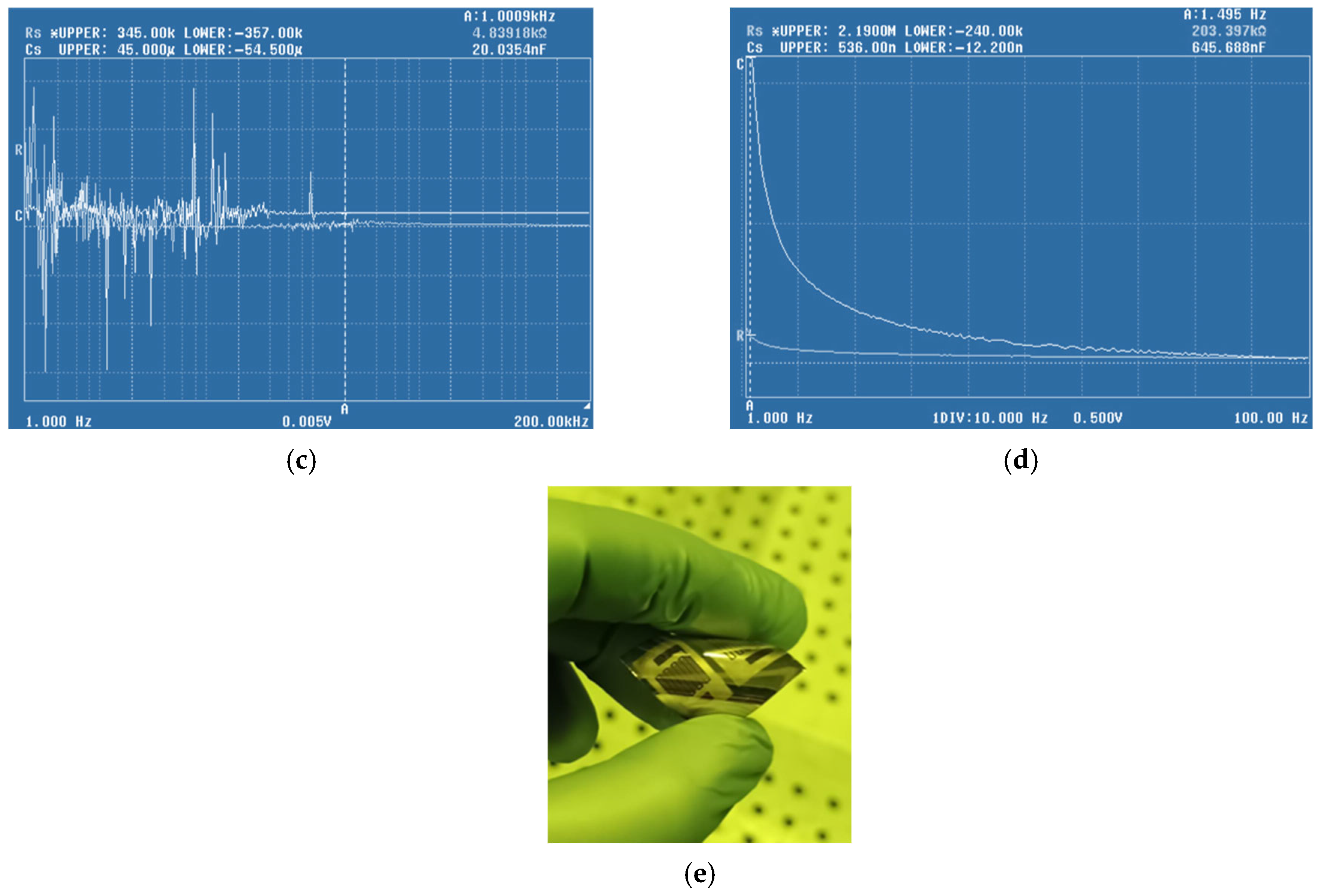 Cortisol solutions based on Dimethylformamide solvent (DMF) with cortisol concentrations in the range from 2 ng/mL to 500 ng/mL were drop-casted by automatic micropipette. Four-terminal setup, or the Kelvin technique, was applied for the electrical characterization of the samples to ensure the highest possible accuracy and precision in resistance measurements by eliminating the effect of contact resistance. In addition, an impedance analyzer, Hioki IM3570 (Hioki, Nagano, Japan), was connected to measure the contact resistance and parasitic capacitance extracted from the impedance in a frequency range of 1 Hz to 200 kHz and bias voltage of 0.005 V. They were measured to track the quality of the electrical contact after bending.